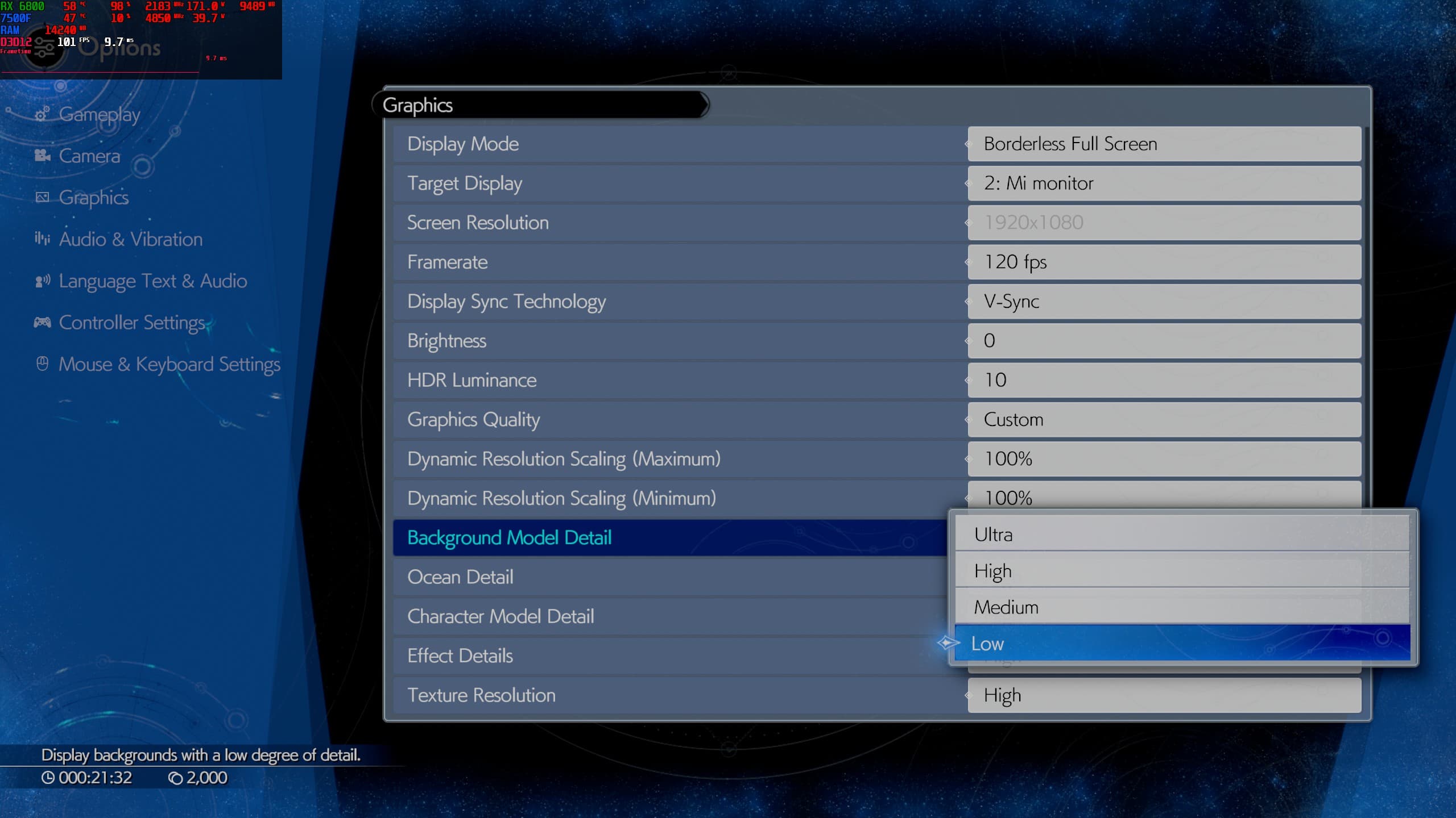При этом всём игра умудряется просаживать частоту кадров в густонаселённых или обширных локациях ниже показателя в 60! И какие настройки не меняй, единственная важная и действительно влияющая на FPS — всего одна: Background Model Detail, то есть «Детализация моделей окружения». И напрямую влияет на близость прогрузки текстур окружения, травы, теней и вообще всего-всего.