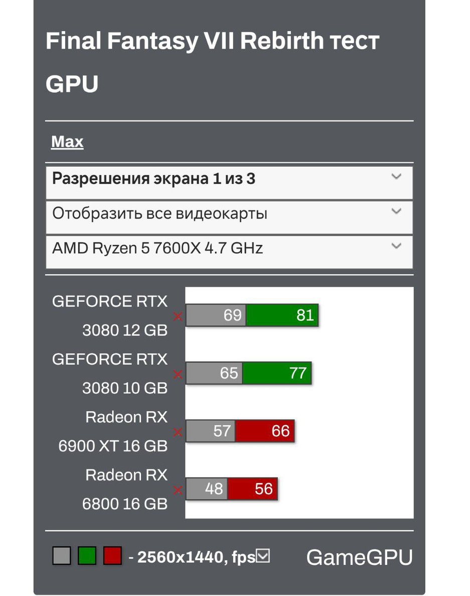 - RX 6800 16 GB — аналог от NVIDIA: RTX 3080, она на 5-10 кадров быстрее моей;