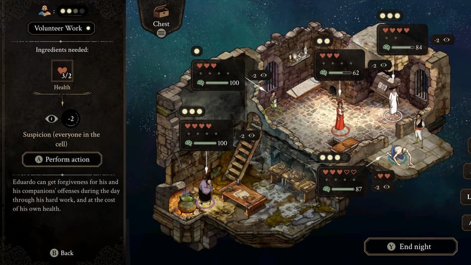 Подпольная деятельность не прекращается даже ночью. В это время герои должны тратить энергию на специализированные действия. Они позволяют: понизить настороженность стражи; восстановить рассудок; создать инструменты и лекарства; позаботиться о ранах; продать краденое; читать книги. Полученные из книг знания нужны для открытия новых умений.