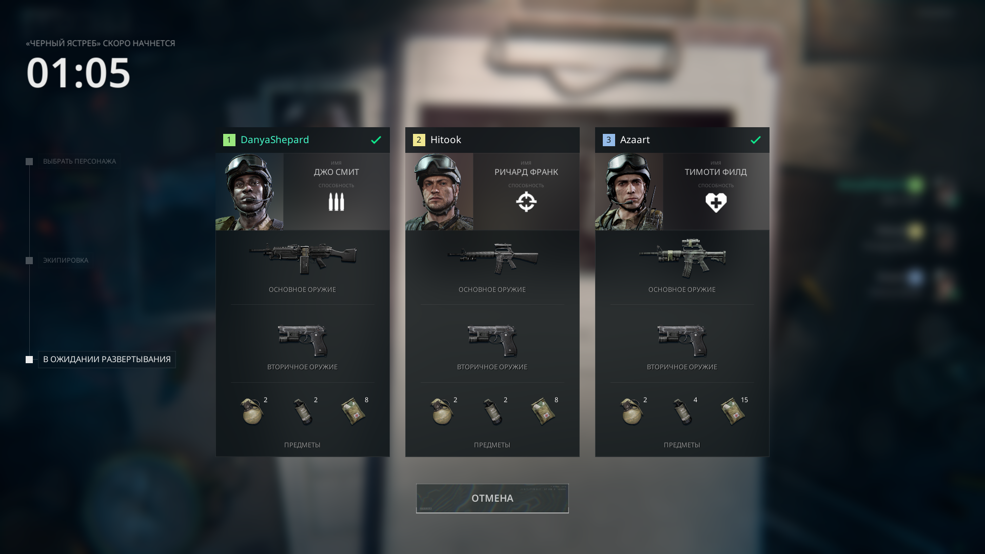 Каждая миссия начинается с экрана подготовки. Игра даёт на выбор четырех реальных бойцов спецподразделения «Дельта», для каждого из которых заготовлены варианты обмундирования. Туда входит стрелковое оружие, набор гранат и аптечек, а также классовый перк, дающий отдельные бонусы. У штурмовиков больше осколочных гранат, снайперы носят оптические прицелы, а поддержка и медики носят больше патронов и аптечек, соответственно, и владеют навыком делиться с другими.