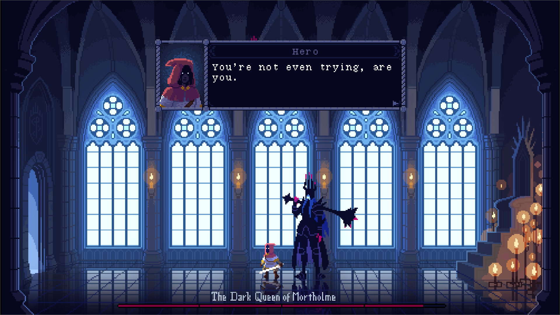 Здесь главным героем является финальный босс, как будто из какой-то частей Dark Souls. Игроку дают управлять могущественной Королевой Тьмы — она располагает внушительным здоровьем, набором умений и финальной формой. Данный арсенал нужно использовать против маленького Героя, от лица которого обычно ведётся повествование в таких играх.