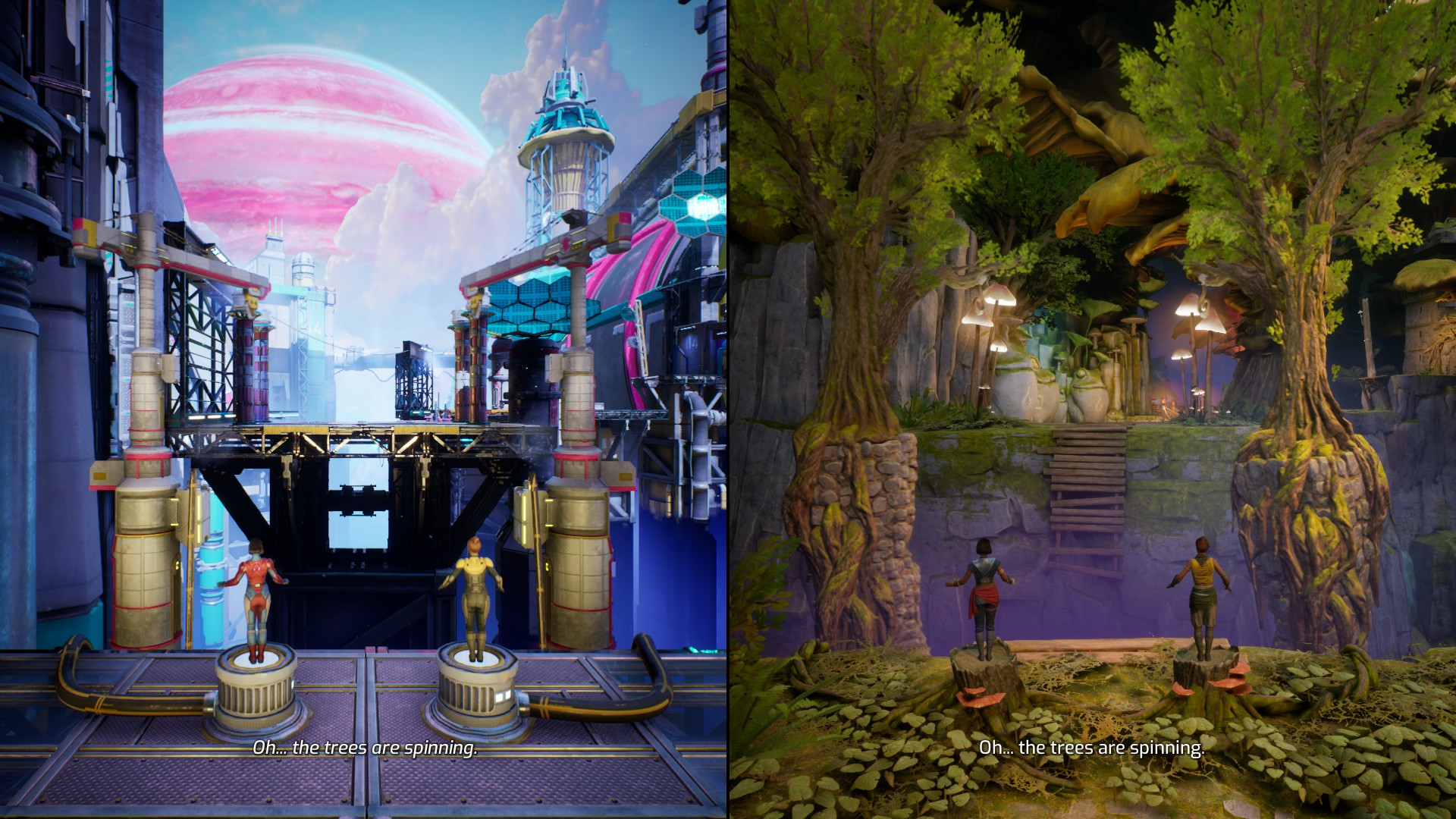 На одном уровне девушки прыгают по крышам летающих автомобилей, несущихся по магистралям неонового мегаполиса далёкого будущего, пытаясь добраться до главы злобной корпорации, а на следующем им необходимо взрастить драконов, чтобы те помогли им сразить древнего и опасного зверя. Это не просто смена декораций, а полное переосмысление большей части механик. Игра требует полной синергии, хотя зачастую обе героини выполняют совершенно разные задачи, пытаясь достичь общей цели.