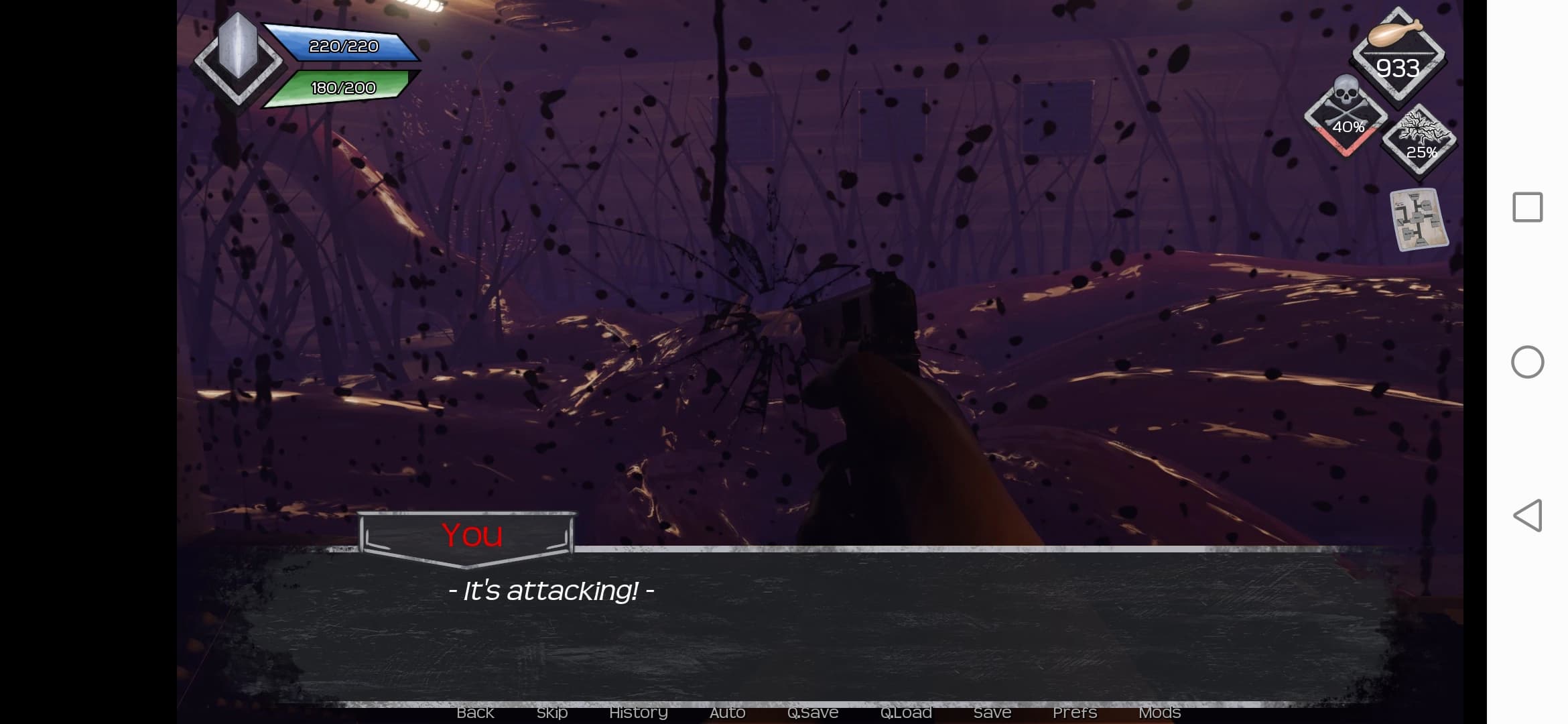 Каждое действие вне базы повышает шкалу агрессии монстров. Если она достигает 100%, то на протагониста нападёт монстр – изменённый туманом енот, кабан или человек. Бой сводится к использованию основных и второстепенных атак. Если потерпеть поражение, то протагонист вернётся домой с пустыми руками. За победу же награждают опытом, который повышает здоровье, выносливость, и понижает штраф за использование усиленной атаки.
