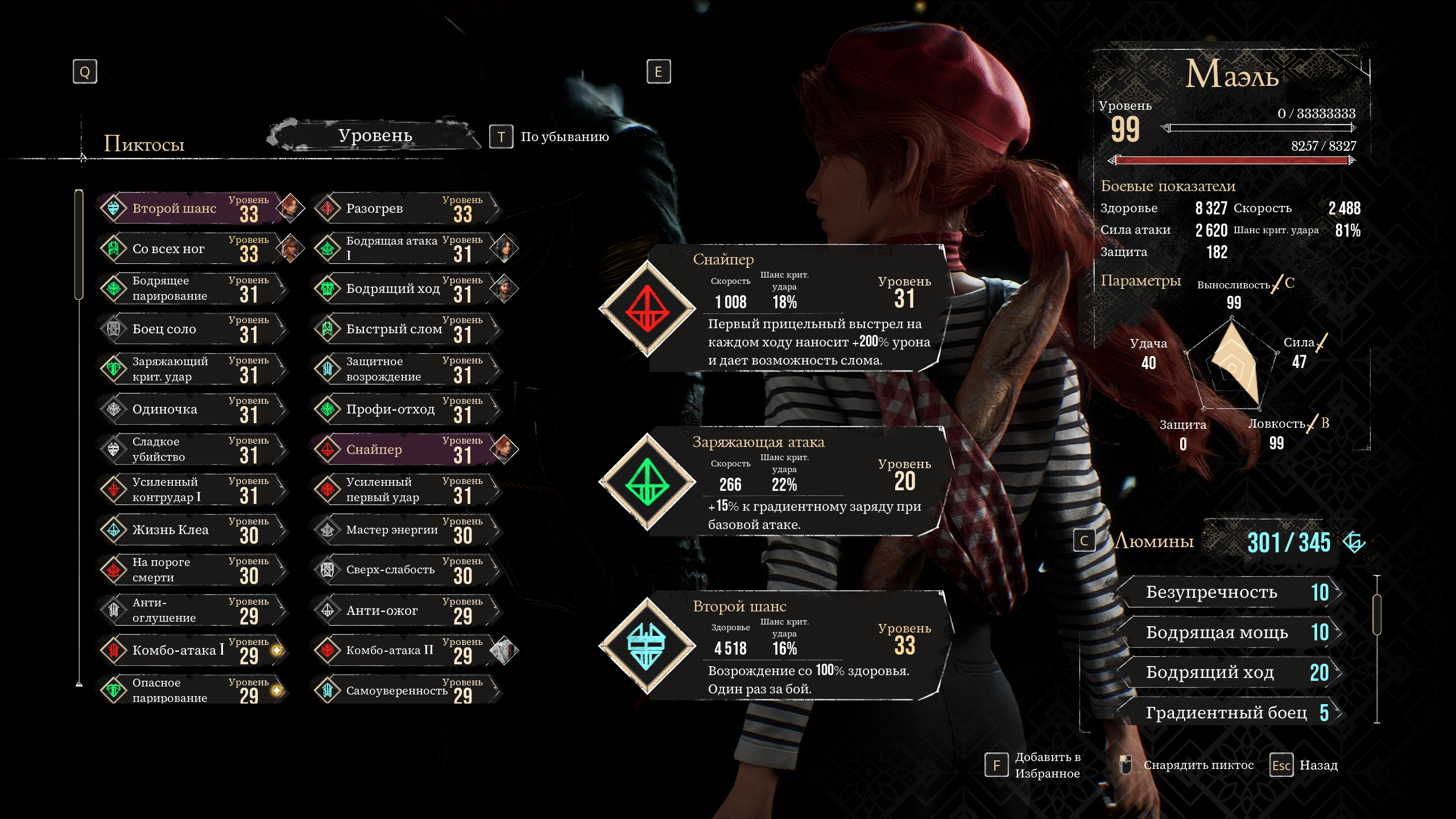 Пиктосы — это, по сути, снаряжение, которое при экипировке даёт прибавку к характеристикам вроде скорости, защиты, здоровья или шанса крита. Кроме того, они несут пассивные бонусы, которые могут быть самыми разными: от автоматического наложения щита при вступлении в бой до воскрешения, усиления урона от контратак после парирования и ещё десятков полезных эффектов.