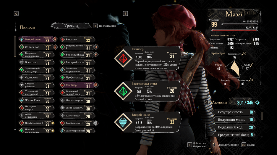 Таким образом, даже искусная фехтовальщица Маэль, у которой среди умений нет способностей к исцелению, может стать полноценным лекарем или танком — всё зависит от выбранного клинка. А дополнить картину помогут Пиктосы и Люмины.