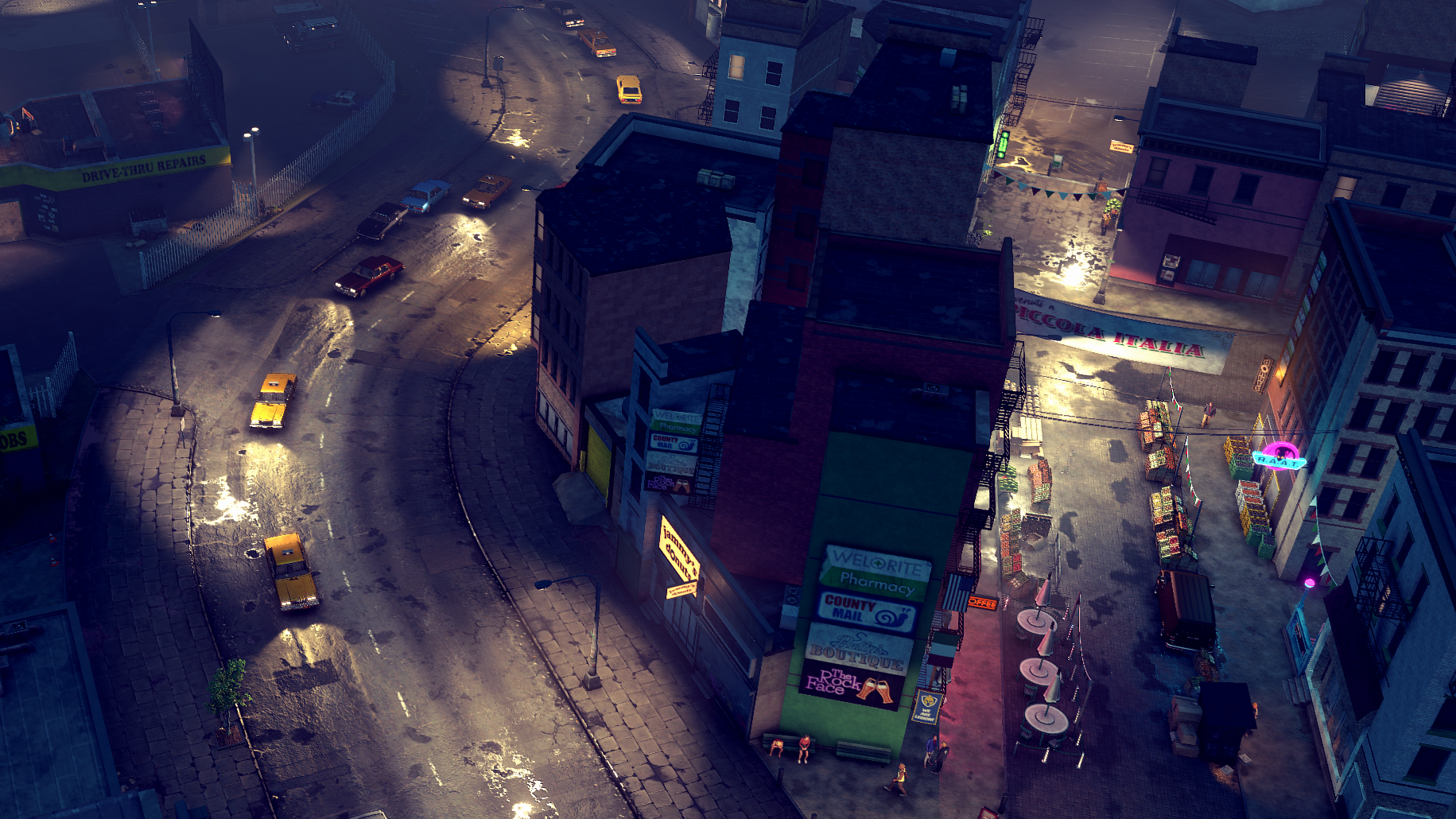 Стилизация под реализм с толстыми контурами в духе сел-шейдинга выглядит любопытно, а с наступлением темноты пробуждается не только мафия, но и чувство восторга — настолько эффектно смотрится ночной город. Единственное, что выбивается из общей картины — туман, который выглядит как неестественная белая пелена. При том, что игра на максимальных настройках в нативных 1440p на моей 4070 Super выдаёт около 90 кадров в секунду — столько же, сколько свежий Doom: The Dark Ages на «ультрах». Что само по себе звучит странно.