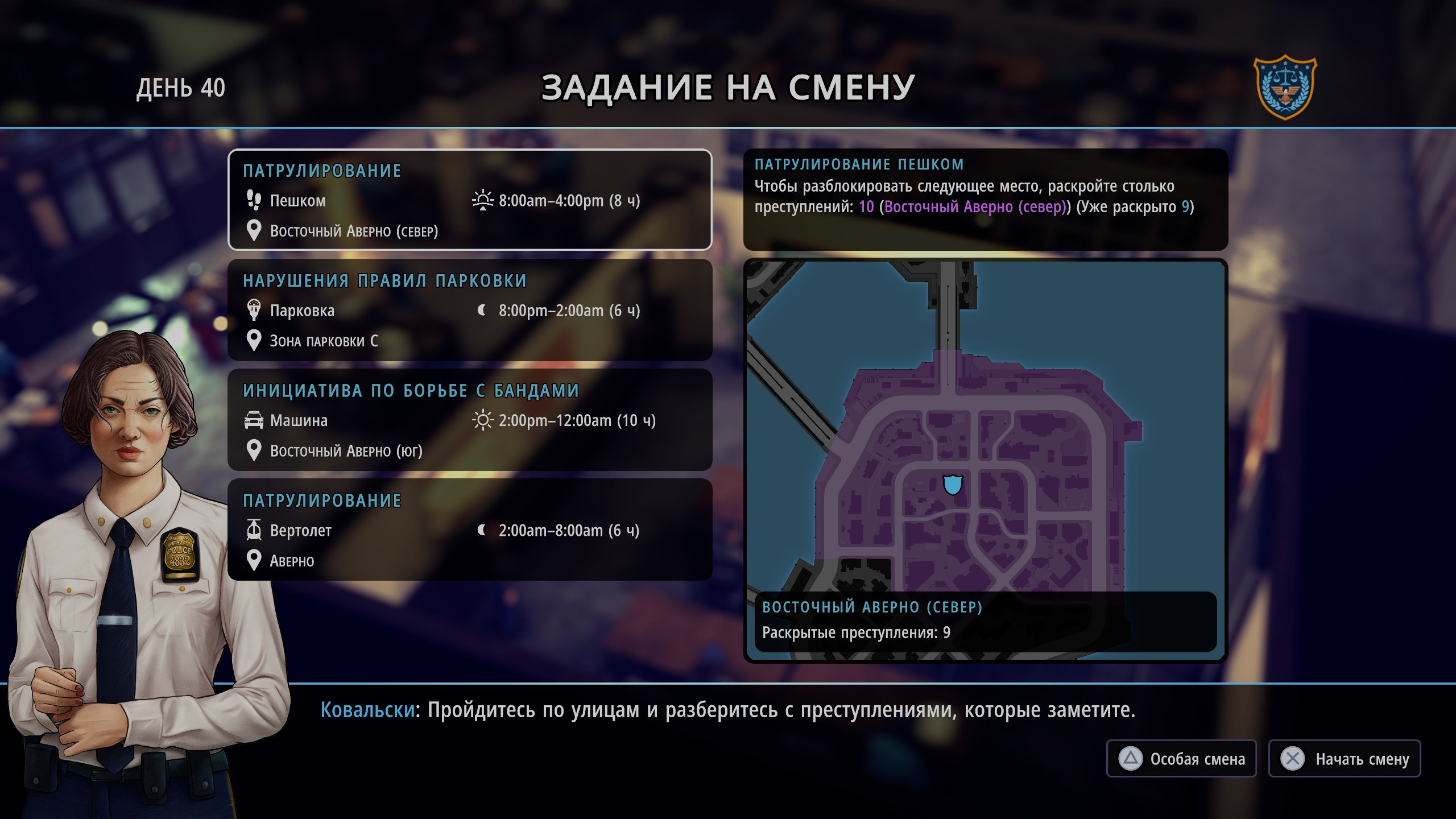 Начинается игра невероятно бодро — мы отправляемся предотвратить ограбление банка, сопровождаемое погоней и перестрелкой. Но сразу после этого темп снижается: игра постепенно знакомит нас с рутинными задачами, которыми и предстоит заниматься большую часть времени. Игровой процесс построен циклично: каждый день мы начинаем смену в участке и выбираем один из типов патруля — пеший обход района, проверку нарушений парковки, патрулирование на автомобиле или вертолёте.