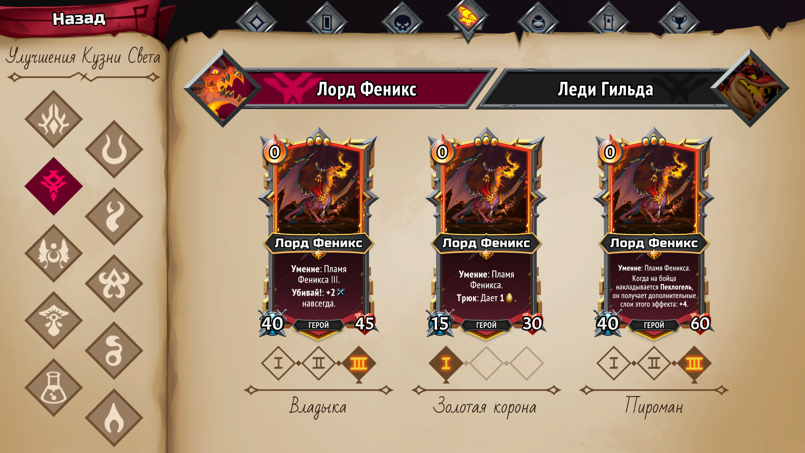 Пеклорождённые — клан жадных до золота драконов, для которых нажива стоит на первом месте. Их механики полностью отражают эту философию: добыча чистого золота, сбор золотых яиц (которые можно обменять на артефакты и ресурсы), спам мелких дракончиков-камикадзе, которых можно подрывать активным умением между ходами. И, конечно же, в их арсенале предостаточно способов заставить врагов полыхать — как в прямом, так и в переносном смысле.