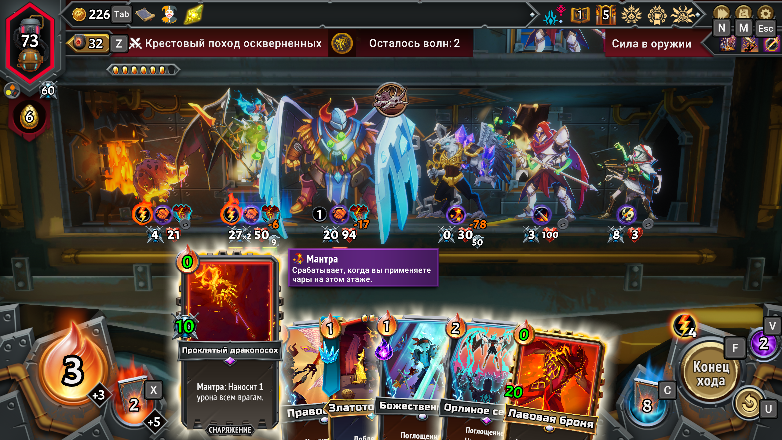Снаряжение — как и подсказывает название, это карты, которые можно «надевать» на бойцов. Бонусы бывают простыми — например, +к здоровью или +к атаке, — а бывают с характером. Скажем, предмет, наносящий урон, равный текущему запасу здоровья юнита, которого атакует враг. Или артефакт, наносящий урон при каждом перемещении между этажами. Особенно приятно снарядить им летающего босса — и наблюдать, как его здоровье тает без вашего участия.