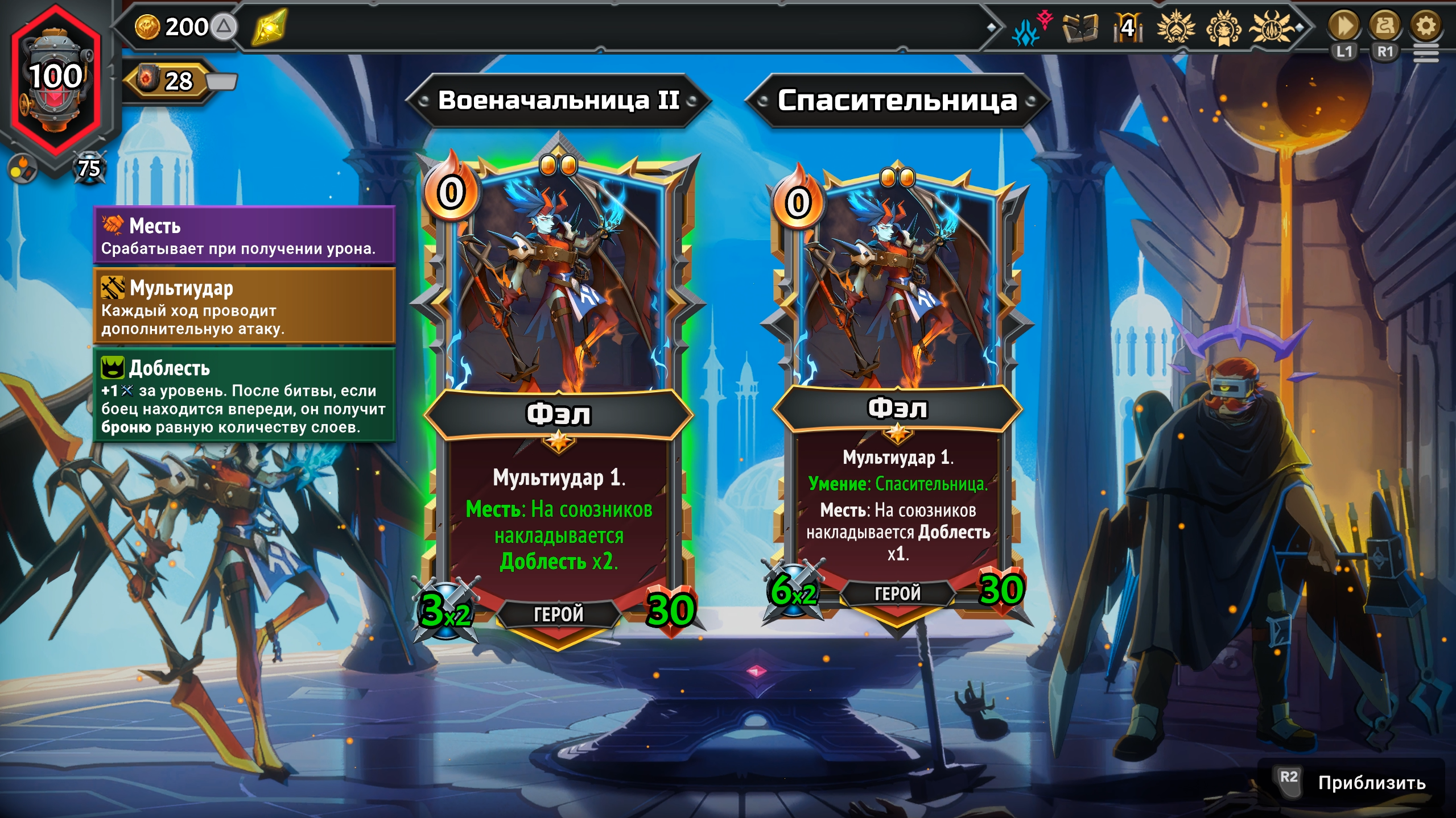 Например, Фэл — первая героиня, с которой мы знакомимся, — способна накладывать на себя доблесть: эффект, повышающий исходящий урон и броню, превращая её в полноценного танка на передовой, способного прикрывать весь этаж. Одна из базовых стратегий на старте игры строится вокруг того, чтобы как можно быстрее усилить Фэл доблестью, превращая её в практически бессмертного бойца, способного в одиночку расправляться с любыми противниками.