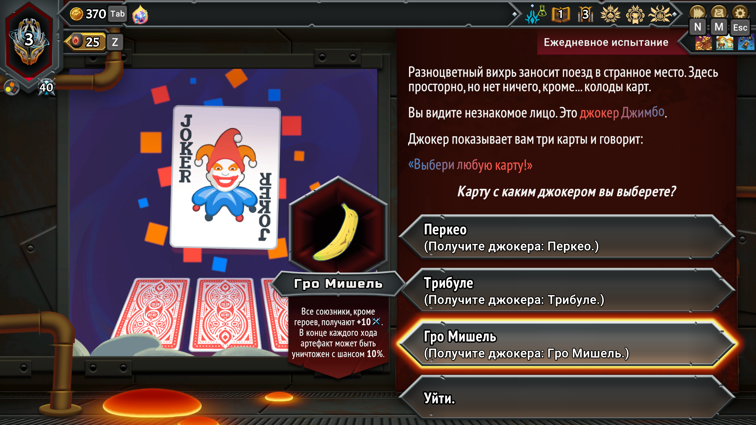 Разумеется, в Monster Train 2 появились новые артефакты, а также случайные события с разнообразными бонусами — некоторые из них отсылают к другим известным рогаликам. В пути можно встретить, например, Джокеров или бананчик Гро Мишель из Balatro, наткнуться на Горностая из Inscryption, призвать культистов из Cult of the Lamb или разжиться артефактами из Inkbound.