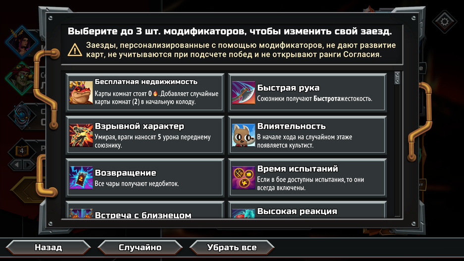 Однако стоит понимать: при использовании этих модификаторов развитие карт блокируется, вы не получите золотую рамку за победу, такие забеги не засчитываются в статистику и не открывают новые уровни возвышения.