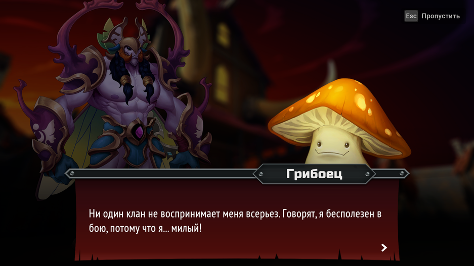 Вот, например, Лорд Феникс из клана Пеклорожденных — как и подобает уважаемому дракону, чахнущему над златом, — отчаянно пытается загнать всех в долги за «добровольное» снабжение экспедиции ресурсами. А Грибовоин сталкивается с предрассудками со стороны других рас — исключительно из-за своего милого облика, за которым никто не видит свирепого воина.