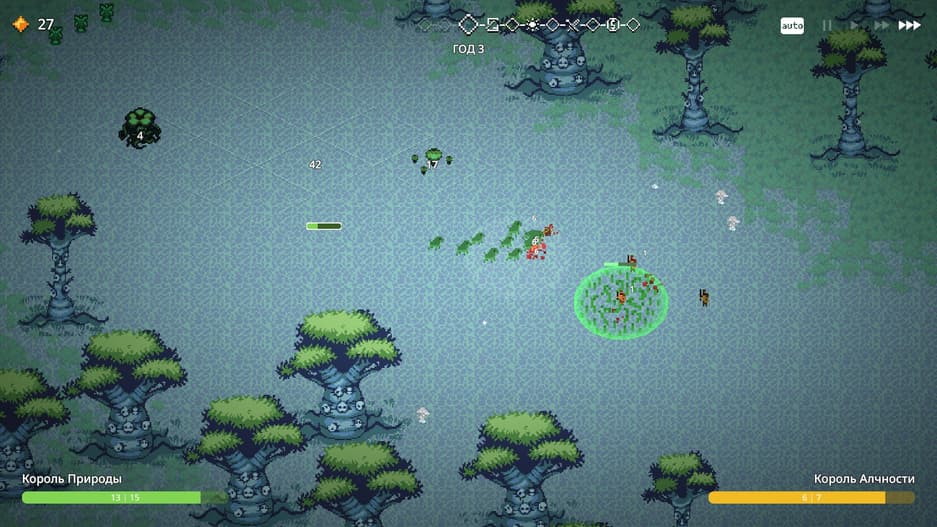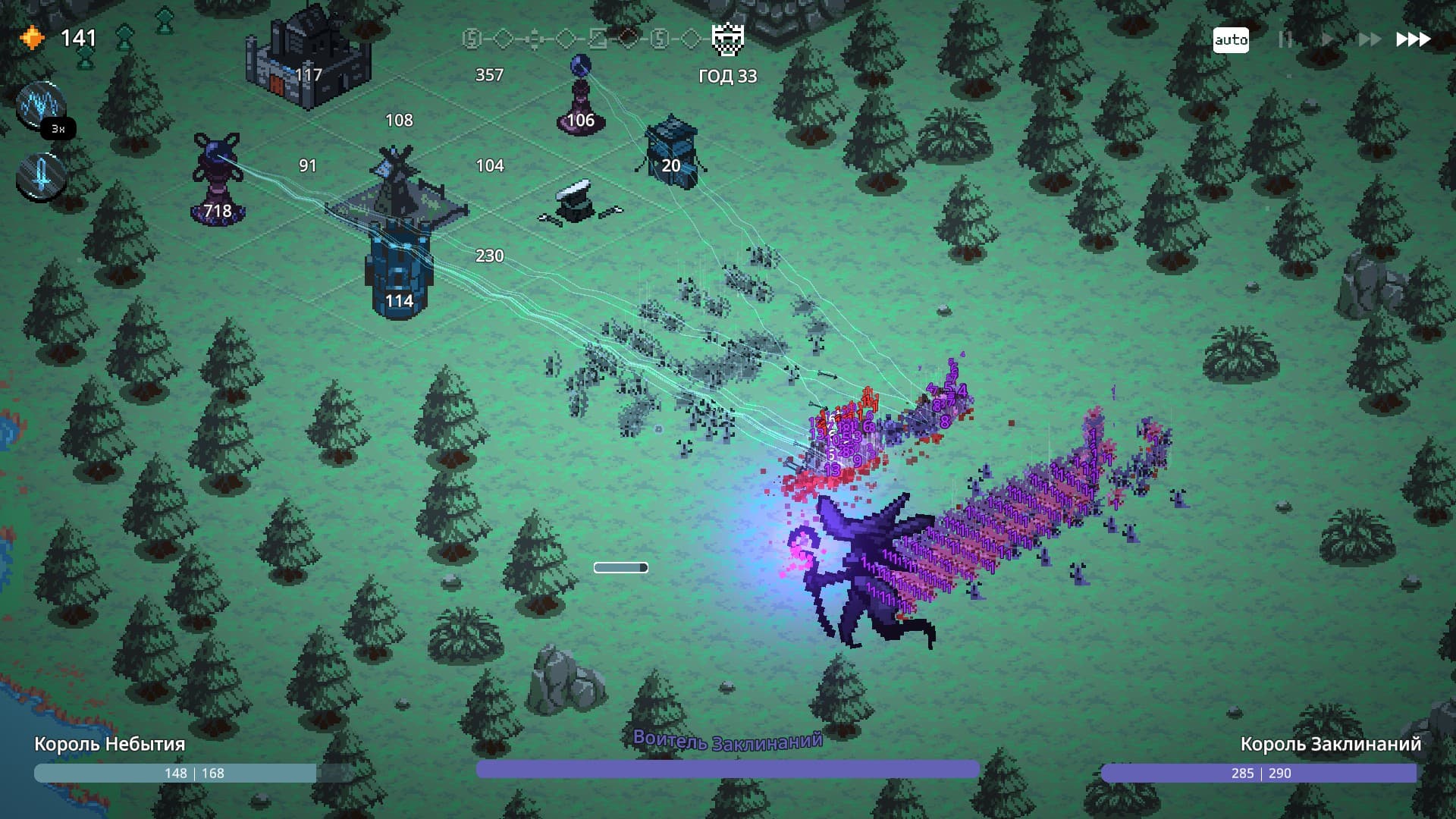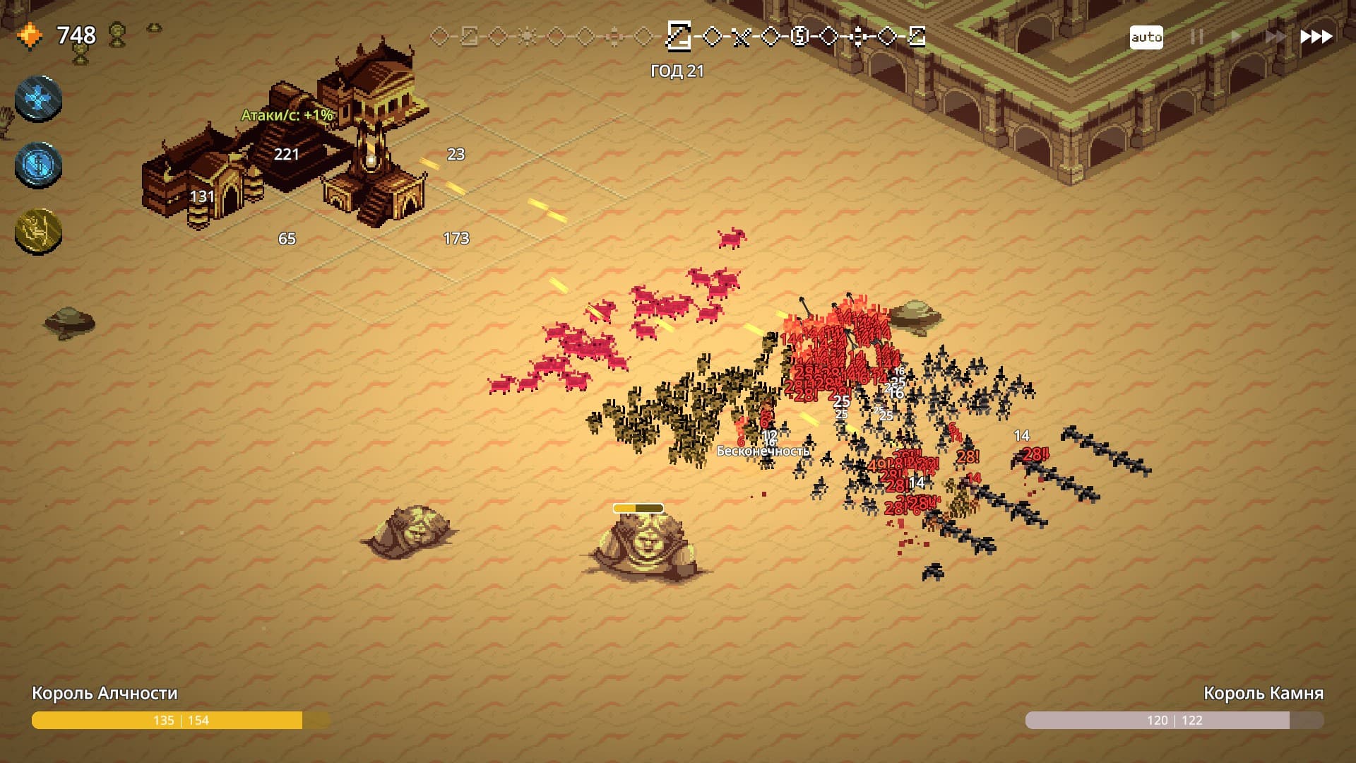 Если дожить до конца, то армия Короля Крови будет практически несокрушимой. Увы, но её на удивление хорошо контрит Король Прогресса – особенно в финальной волне. Его летающий чемпион оставался неуязвимым для наземных войск, в то время как стрелки расстреливали мои войска с расстояния. А из-за автоматической природы боёв я не мог приказать им сменить цель.