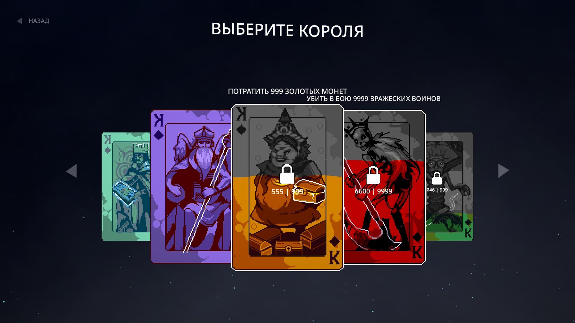 После победы или поражения – выбранный король повышает уровень, что позволяет открывать для него приятные пассивные бонусы.