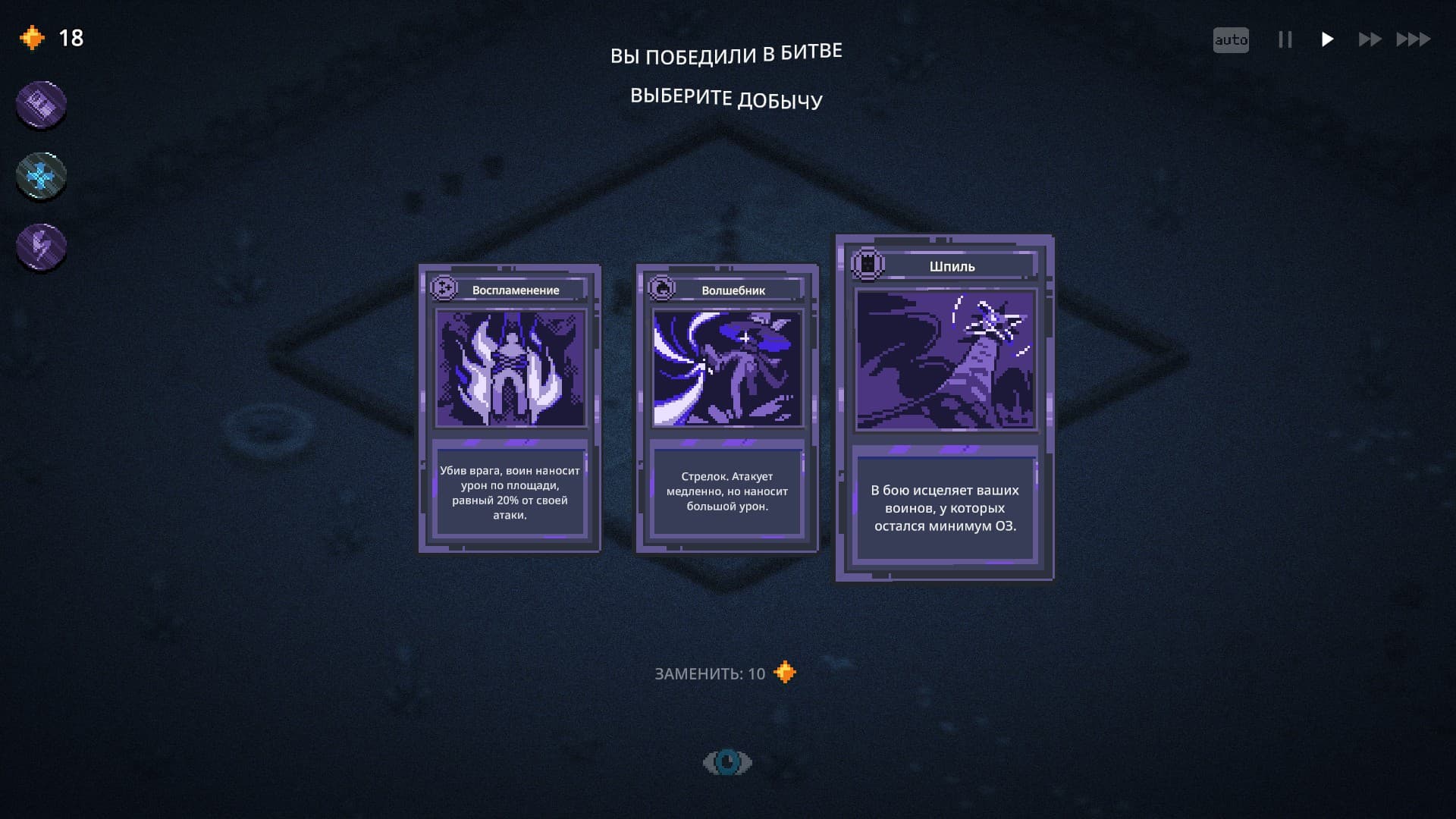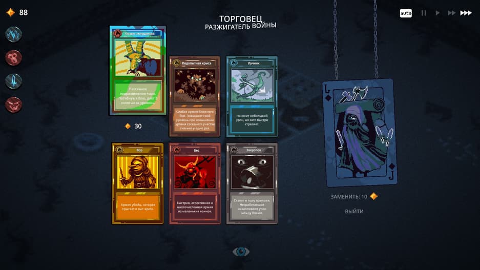 - Редкие радужные карты обладают наиболее мощными эффектами: повышение уровня или характеристик случайной клетки в каждом новом ходу; значительное усиление войск; призыв войск по типу слизи, которая клонирует себя на любую незанятую клетку.