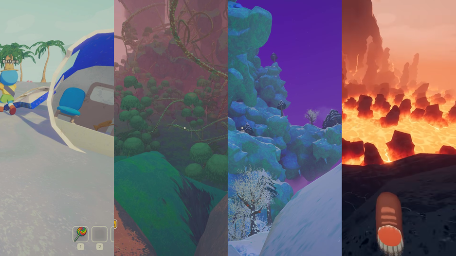 Начинаете вы на Берегу с его обманчиво спокойными, но шаткими скалами и мостами. Далее вас ждут Тропики — лабиринт скользких от влаги уступов, ядовитых растений, взрывающихся при неосторожном приближении, и густых зарослей, где легко заблудиться. Подъем выше ведет в Альпы, царство льда и ветра, где главный враг — ползучий туман. Он не просто скрывает путь, но и несет с собой убийственный холод, высасывающий выносливость и здоровье, вынуждая искать укрытие или использовать предметы против обморожения. Финальная битва разворачивается в Кальдере вулкана, где нужно скакать по раскаленным скалам, избегая приливов лавы, и карабкаться по отвесным стенам под палящим жаром.
