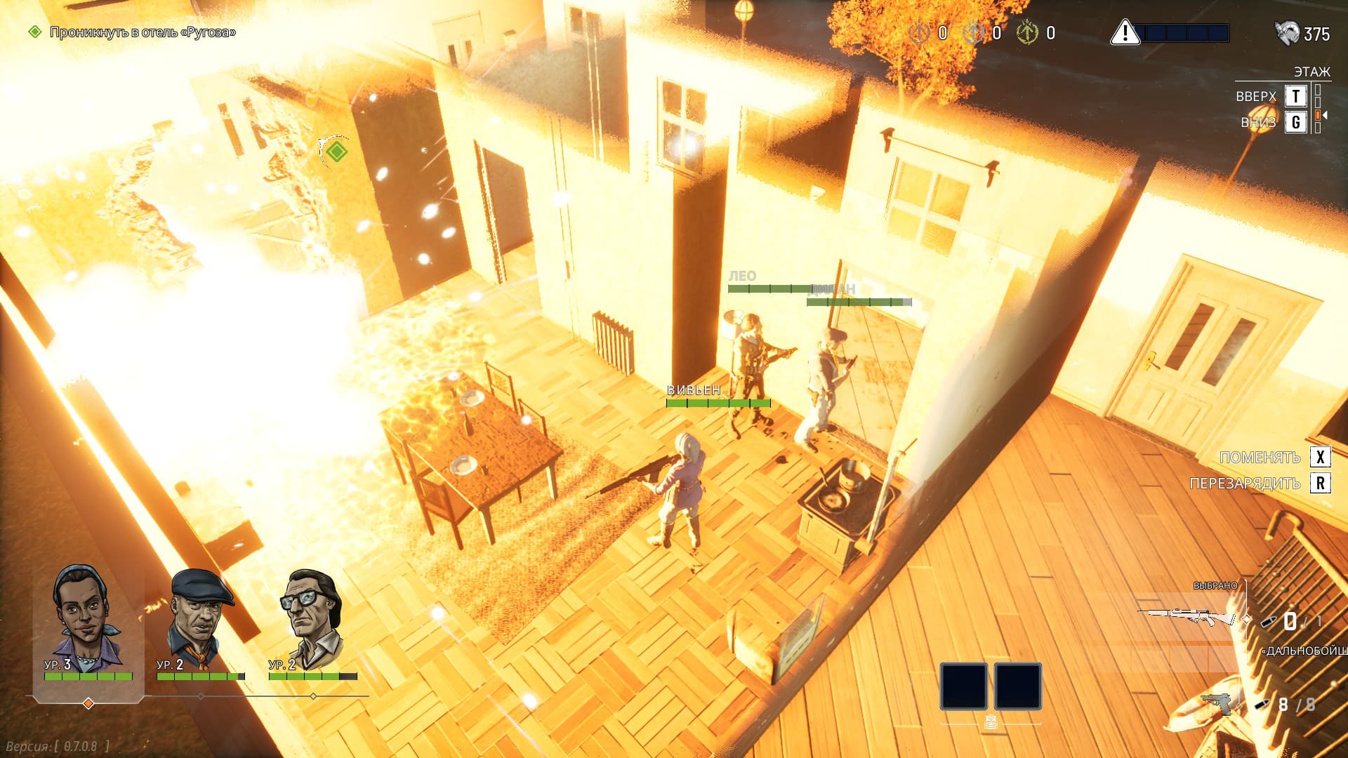 Если мимо противников не удастся прокрасться, то начинается битва. У каждого бойца есть очки действия, которые расходуются на движение, действия и атаку. До атаки стоит расставить всех по укрытиям и назначить зону наблюдения – попавшегося в неё врага можно расстрелять. Если враги столпились в кучу, то можно закинуть к ним гранату.