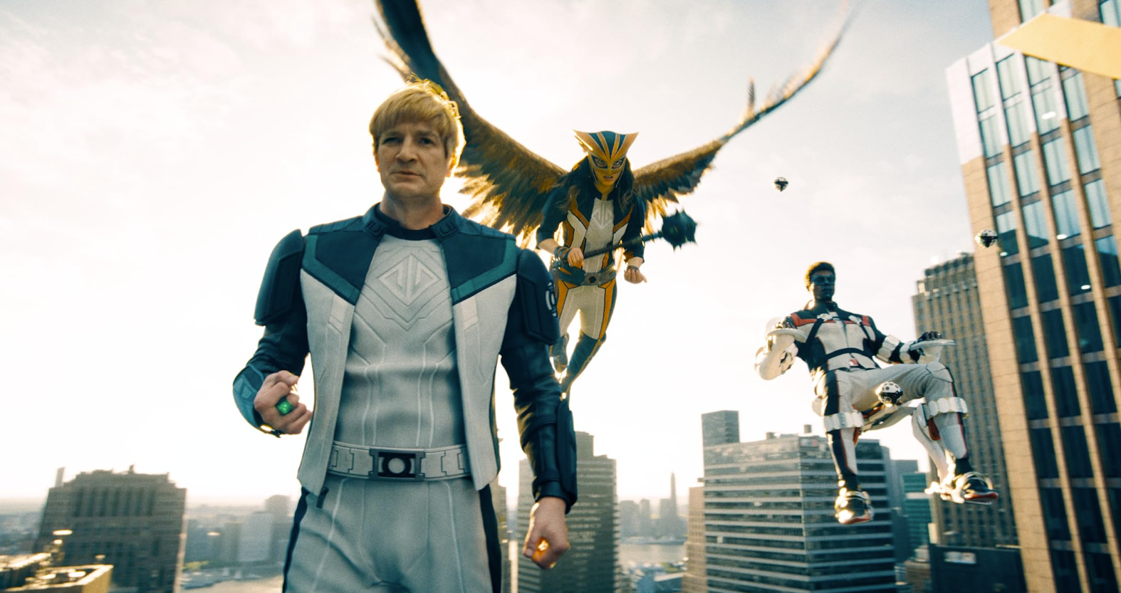 - Зелёный фонарь — Гай Гарднер — в исполнении Нейтана Филлиона кажется дураком, с которым связано несколько шуток, но по итогу впечатления от его героя исключительно положительные: он весёлый и стильный, пусть и недалёкий. В нём неплохо сочетаются жестокий подход к делу — он часто упрекает Супермена за наивность — и доброта, с которой он спасает детей;