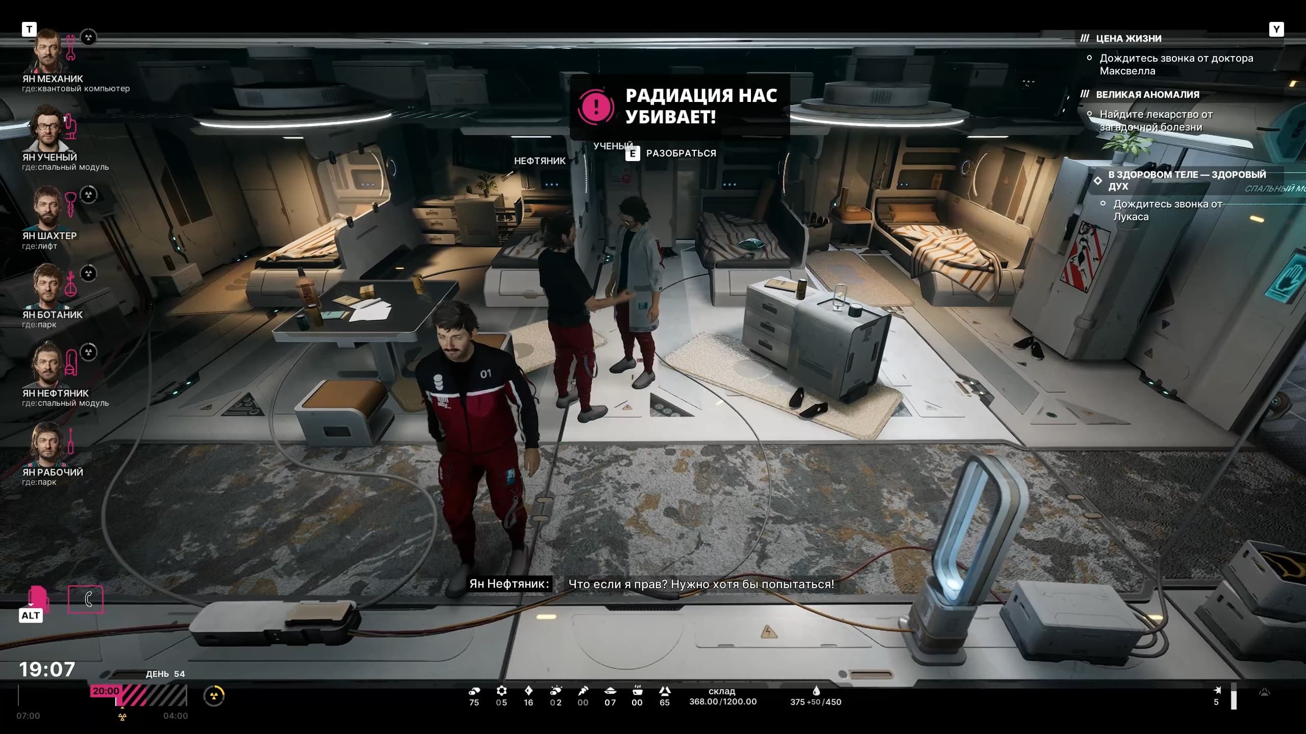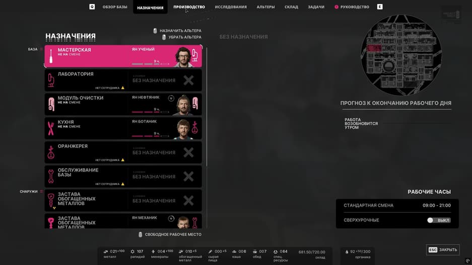 Система управления временем — ключевой элемент. День начинается в 7:00 и заканчивается в 23:00. Альтеры должны работать, питаться, отдыхать и спать — 8 часов сна обязательно. Игрок распределяет задачи: кто создаёт детали, кто добывает ресурсы, кто варит еду. Всё это работает в строгих рамках: не успел — наступила ночь, радиация стала смертельной опасной, и работа переносится на следующий день.