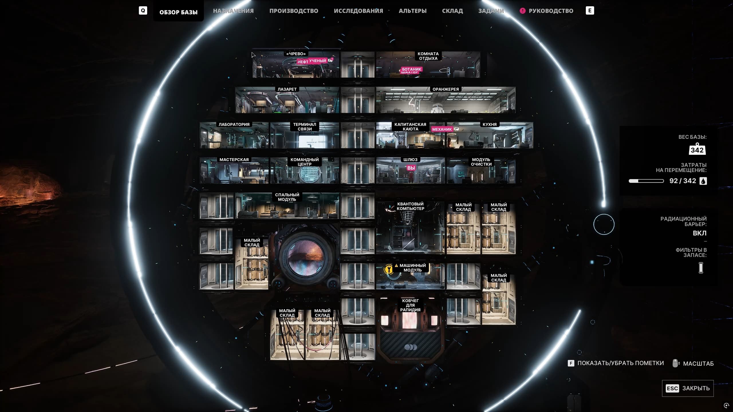 Мобильная база — это целый организм, где в традициях тетриса размещаются модули: от кухни и лазарета до оранжереи, спальни и даже комнаты отдыха. В последней есть экран, на котором устраиваются совместные просмотры странных комичных роликов — пародий на фильмы и рекламу.