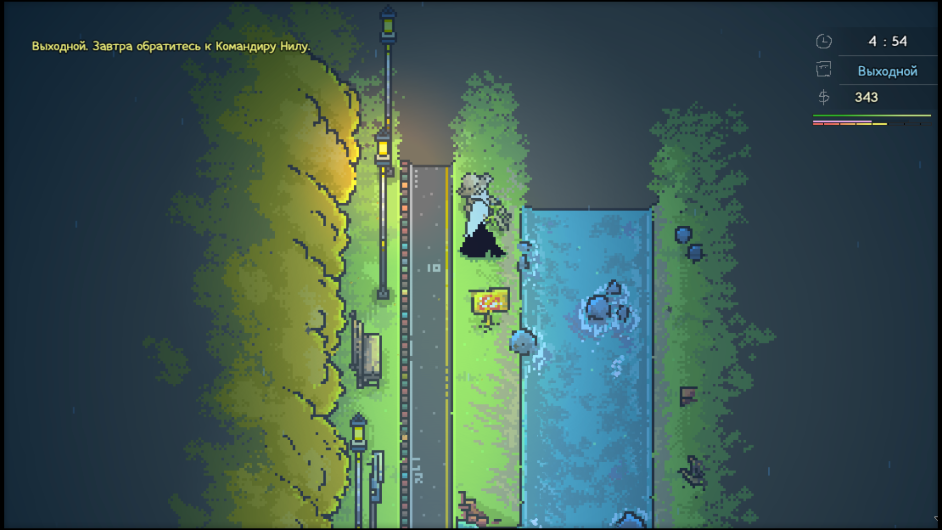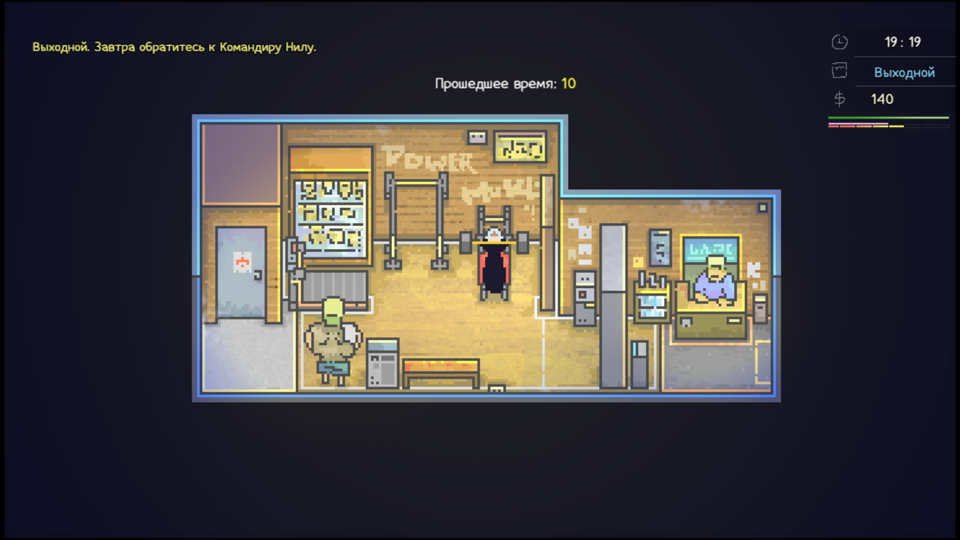 Нужно каждый день ходить на работу, чтобы медленно зарабатывать на улучшения. В остальное время стоит взаимодействовать со всеми объектами и персонажами, чтобы получать звания вроде «Задуватель свечей» или «Слушатель Бота». За такие звания награждают дополнительными характеристиками, которые пригодятся в будущих битвах.