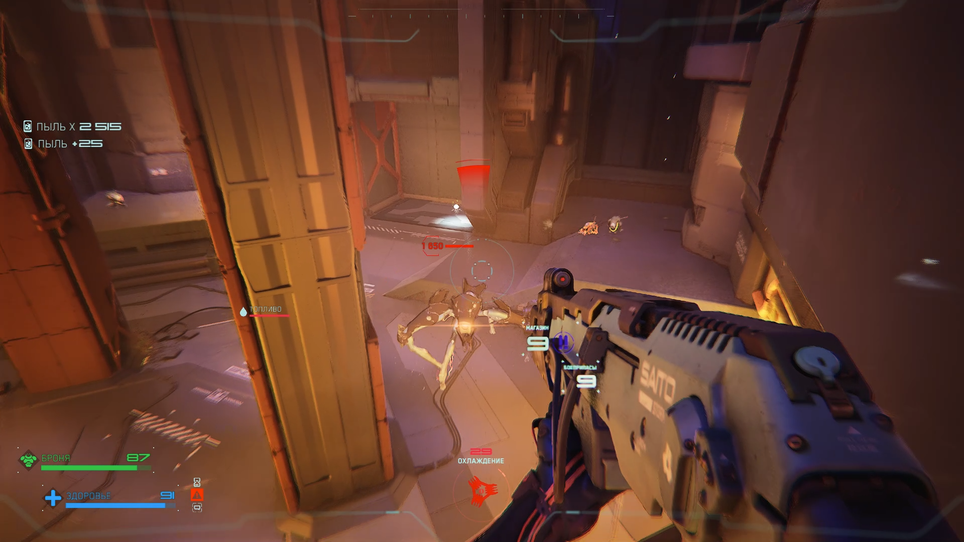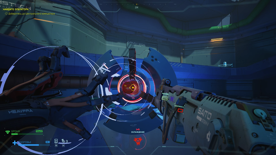 Арсенал в Metal Eden невелик, но продуман до мелочей. Каждый из семи видов оружия имеет своё назначение и раскрывается в определённых ситуациях. Базовые стволы подходят для рядовых противников, когда добивание на перезарядке. Энергетическое оружие и гранатомёт эффективнее всего против тяжёлой брони, а дробовик отлично сочетается с рукопашными атаками. При этом боезапас строго ограничен: один магазин в руках и один в запасе. Такая система вынуждает игрока постоянно менять тактику и оружие, а не полагаться на один удобный вариант. Вместе с тем на аренах всегда есть точки восполнения патронов, здоровья и брони, но чтобы добраться до них и выжить, приходится активно использовать весь набор акробатических возможностей.