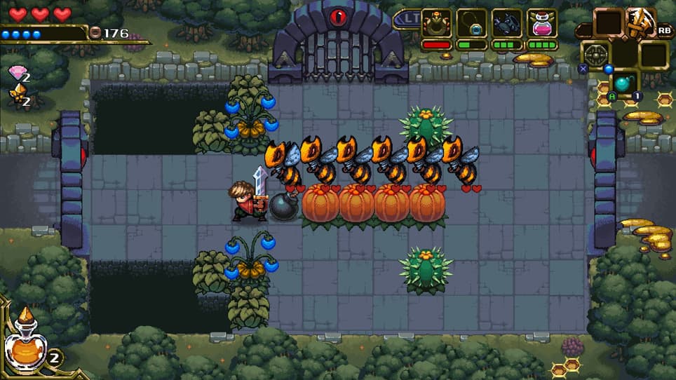 Разгадывание головоломок и уничтожение противников неизбежно приводит к обнаружению новых полезных предметов. Зин начинает с простым мечом и щитом, что за энергию блокирует одну входящую атаку. Со временем он научится использовать бомбы и пинать их, а также стрелять из лука.