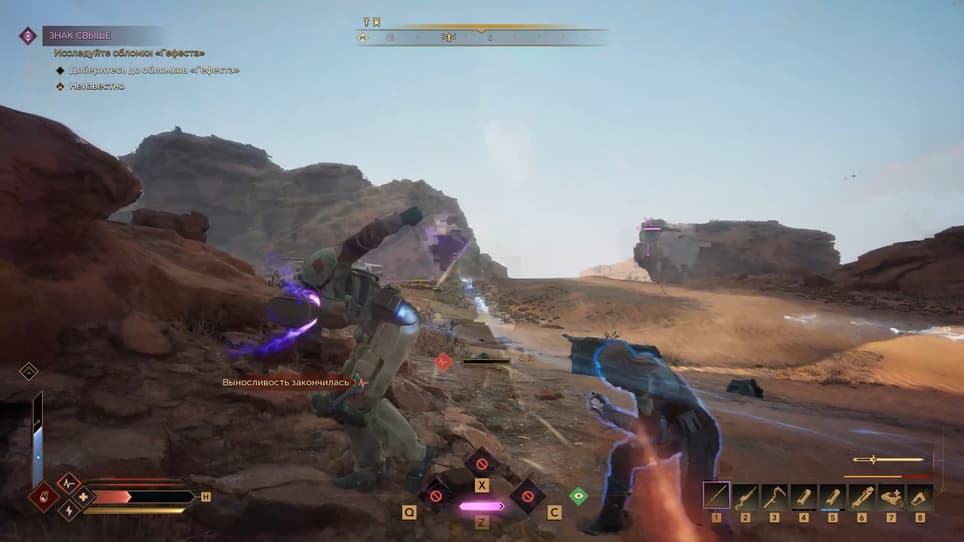 Боевую систему нельзя назвать глубокой или особенной, но есть свои нюансы. Например, использование Щита Хольцмана, отражающего пули и быстрые удары клинком. Он пробивается, но нужно медленно заводить нож внутрь мерцающего поля. Поведение мобов часто предсказуемо – они рьяно защищают своих, поэтому лобовые атаки даже на нескольких врагов нецелесообразны. Но даже при полной потере здоровья у героя остаётся немного времени, чтобы восстановиться — продолжительность зависит от выносливости, а та, в свою очередь, от запаса воды в организме.