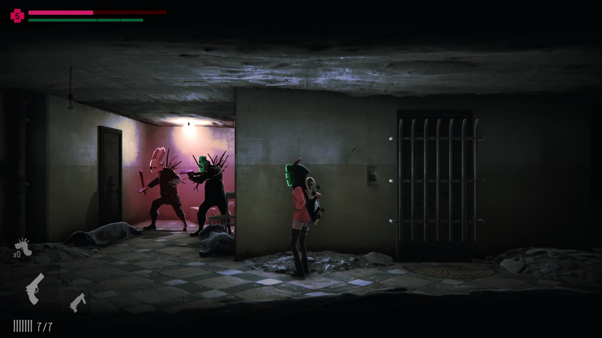 Враги в масках способны стрелять, атаковать и загораживаться щитом, бросать гранаты и камни. Их более элитная версия накладывает на себя защиту, лечится и призывает подкрепления. Причем призыватели становятся неуязвимыми на время вызова союзников — не получится их быстро убрать.
