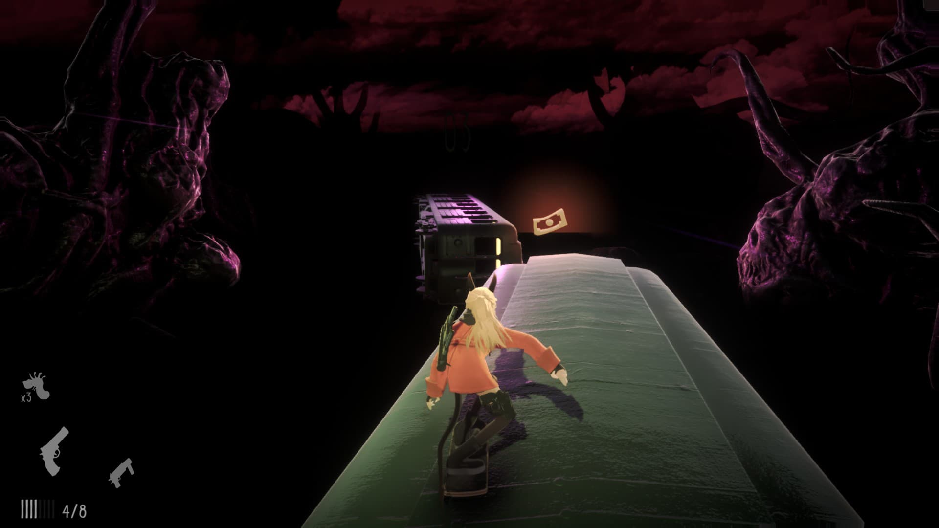 В бою Полли способна бить скейтом, стрелять из пистолета и бросать взрывающиеся личинки – те самые, которые можно пню скормить. Со временем появится возможность использовать одну из дополнительных пушек. Проблема в том, что патроны и нужные предметы выпадают редко – придется бегать с низким здоровьем и беречь припасы на самых злобных противников. Пистолет подпитывается от бочек и убитых врагов, но наносимый им урон оставляет желать лучшего.