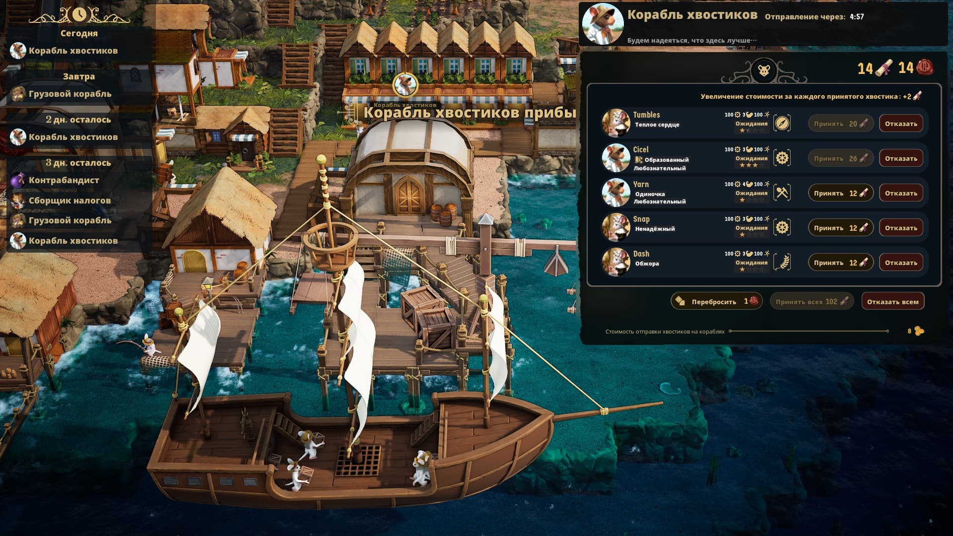 В начале хвостики находятся в восторге от положения дел. Они с радостью согласятся спать на земле и питаться сухарями – одаривая игрока одобрением, которое можно потратить на найм новых грызунов и принятие законов. Законы позволяют хвостикам таскать больше грузов, строить быстрее, работать по ночам.