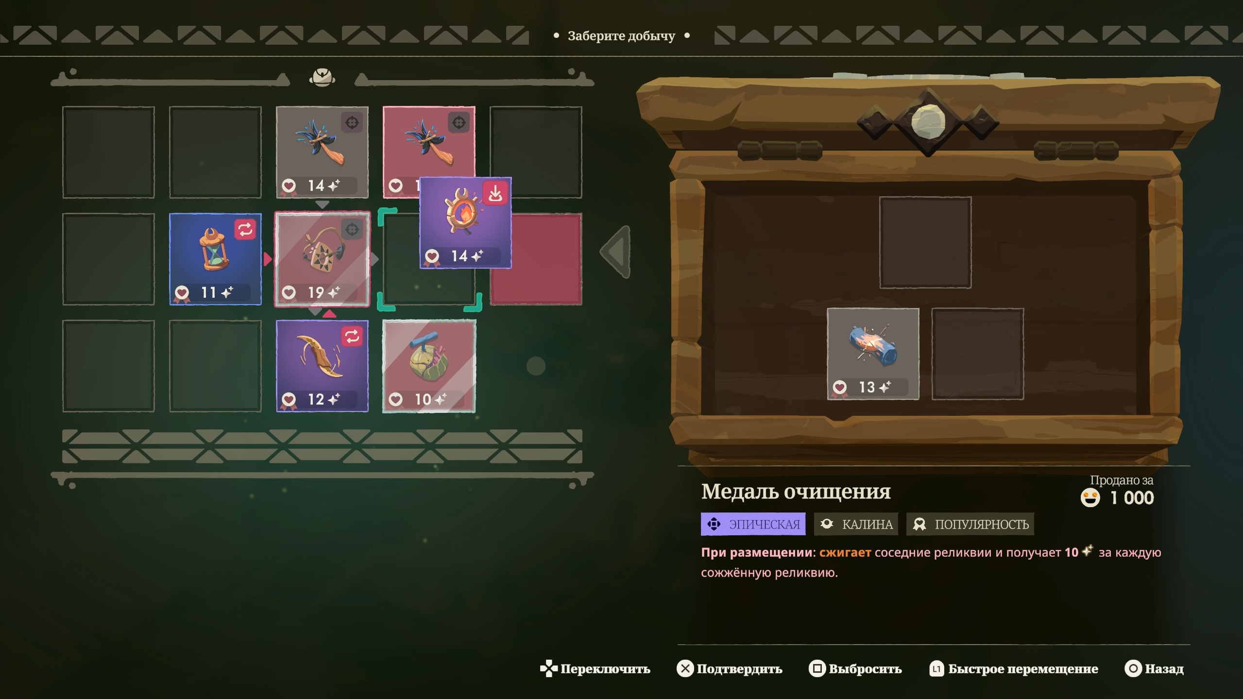 В остальном системы схожи, но главная сложность — ограниченный объём рюкзака. В начале там не хватает места, чтобы держать реликвии про запас, не активируя их эффект. Например, предмет, сжигающий реликвию слева, можно положить в крайний слот, чтобы способность не сработала, а когда потребуется — передвинуть в нужное место.