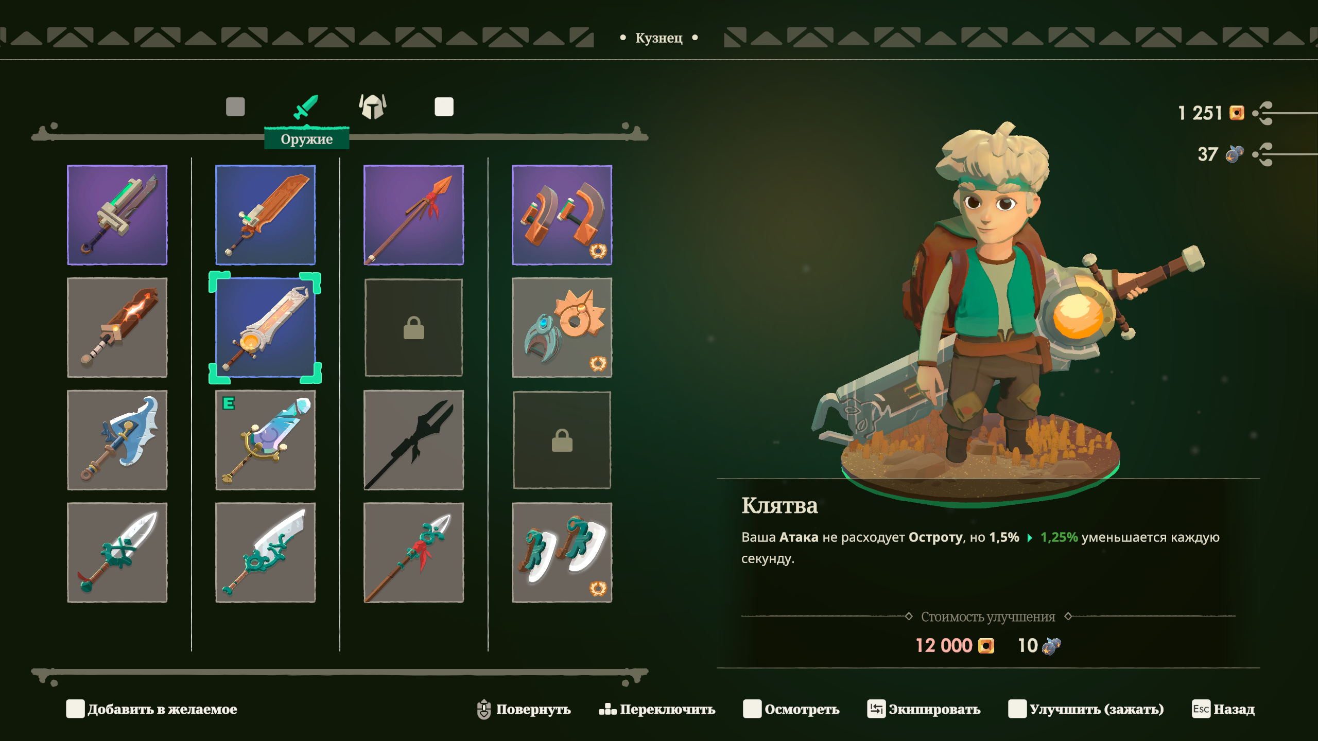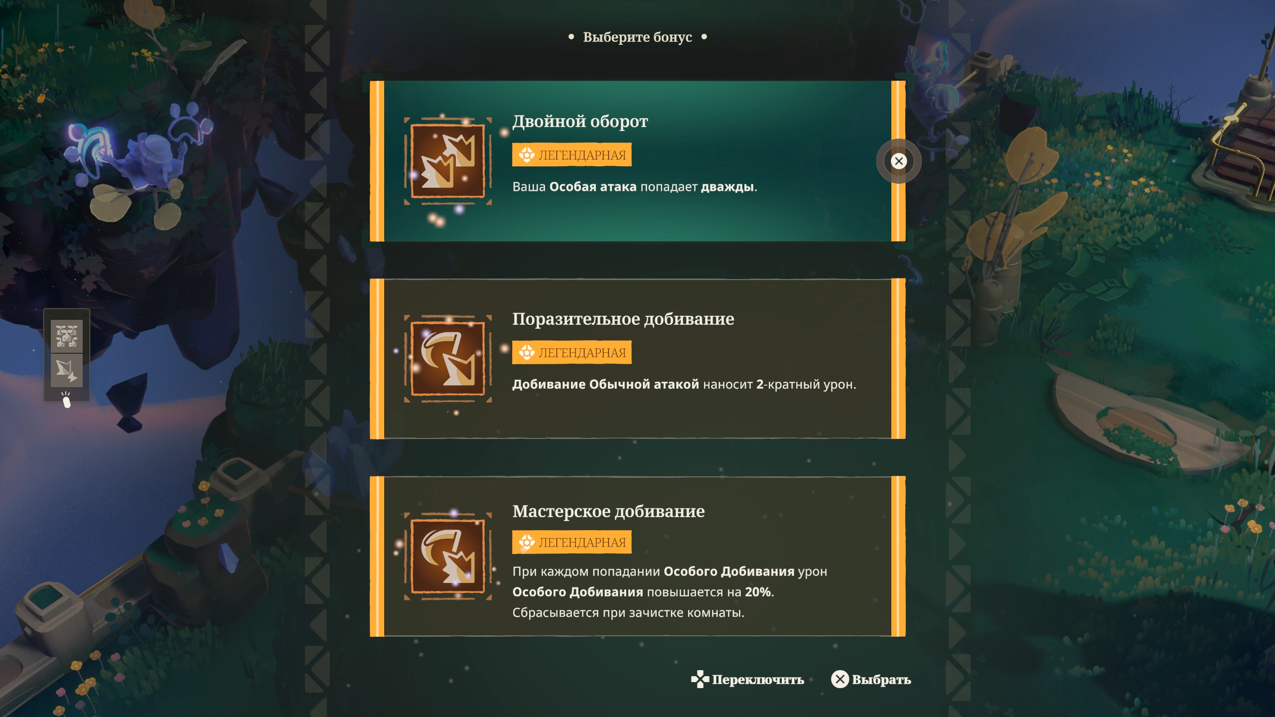 У каждого оружия есть четыре вариации с разными пассивными эффектами — они и компенсируют относительную скромность усилений в забегах. Улучшения не переворачивают игру, но позволяют постепенно найти наиболее удобный боевой стиль.
