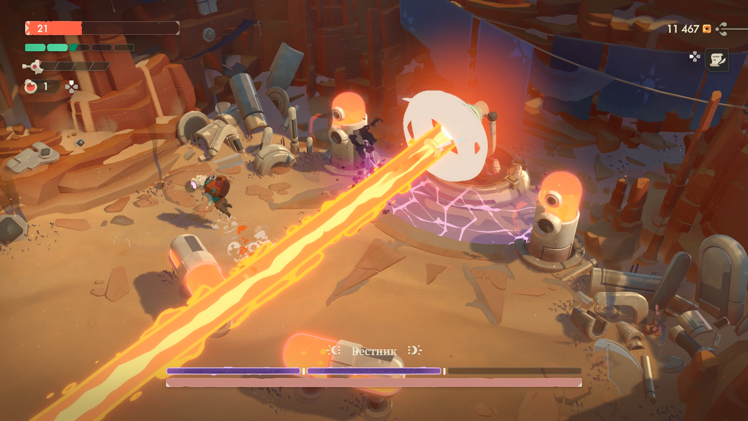 Боссы завершают каждую локацию и служат проверкой на внимательность — и чуть-чуть на реакцию. Их атаки читаются ясно, фазы различаются по ритму, но редко преподносят сюрпризы. Паттерны запоминаются быстро, поэтому сложность ощущается умеренной: успех зависит скорее от собранных усилений и аккуратности, чем от мастерства и филигранного чувства таймингов. Пара зелий исцеления обычно творит своё дело, а иногда достаточно просто не жадничать и не торопиться.