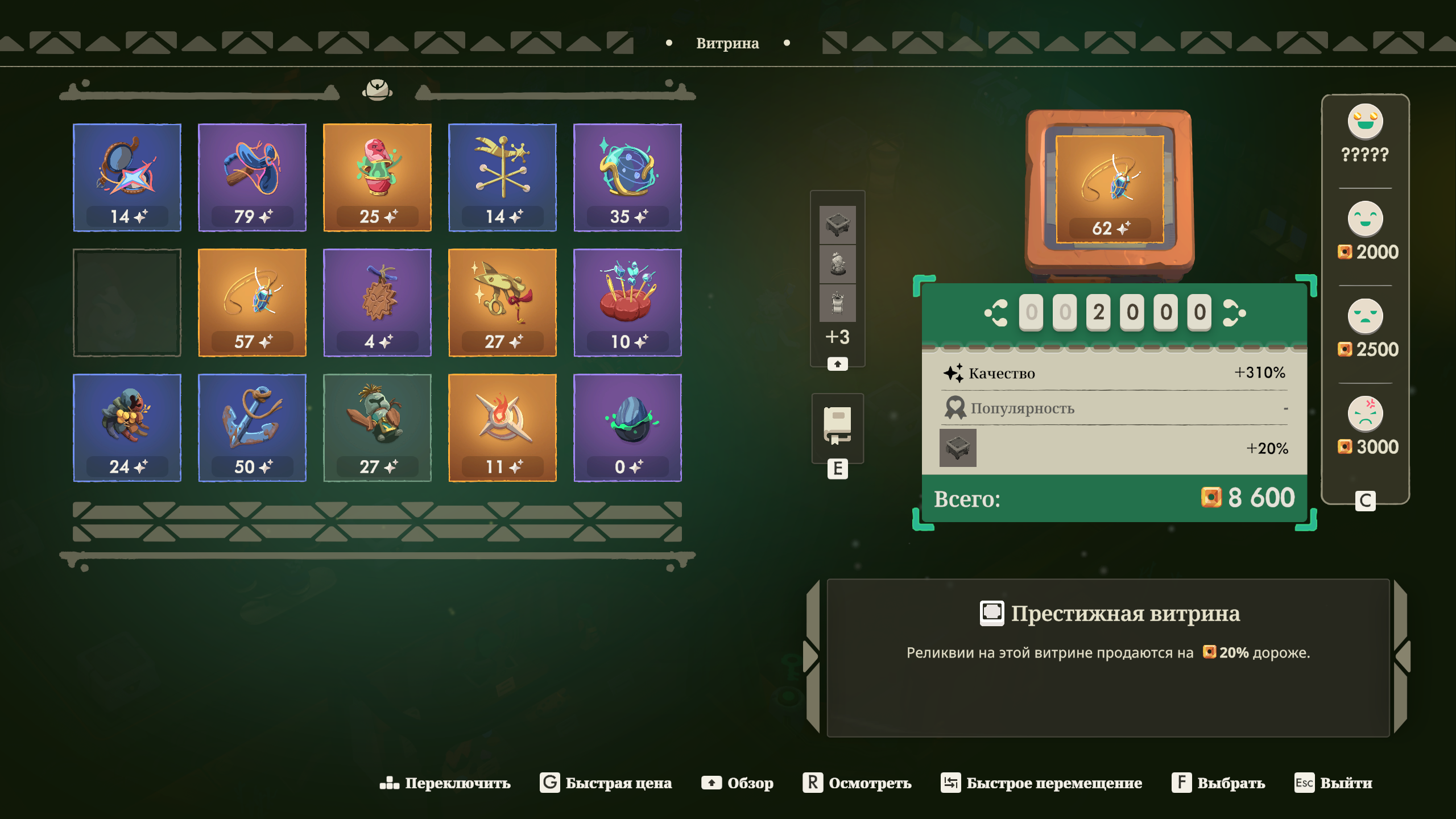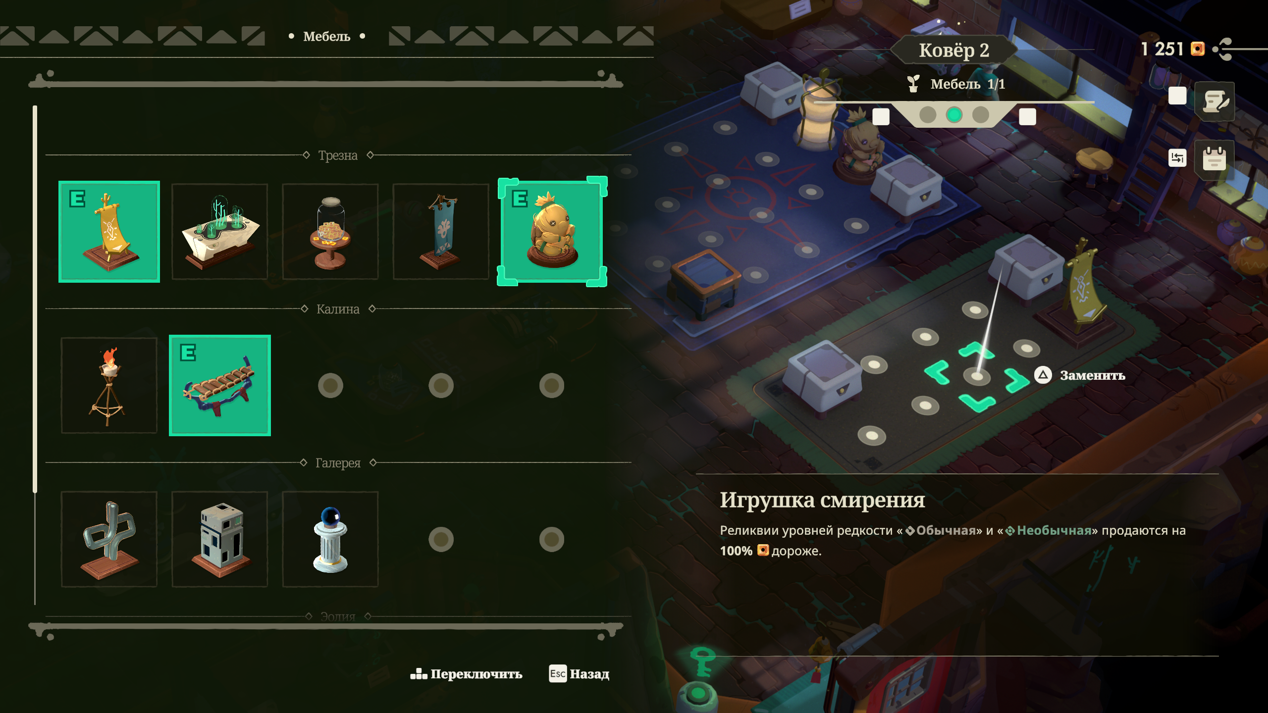 Однако мебель, устанавливаемая через него, влияет не только на визуал. Витрины, ковры, флаги и статуи дают пассивные эффекты: повышают прирост чаевых, увеличивают стоимость определённых типов реликвий или ускоряют их продажу. Это заставляет продумывать планировку магазина и оптимизировать торговое пространство.