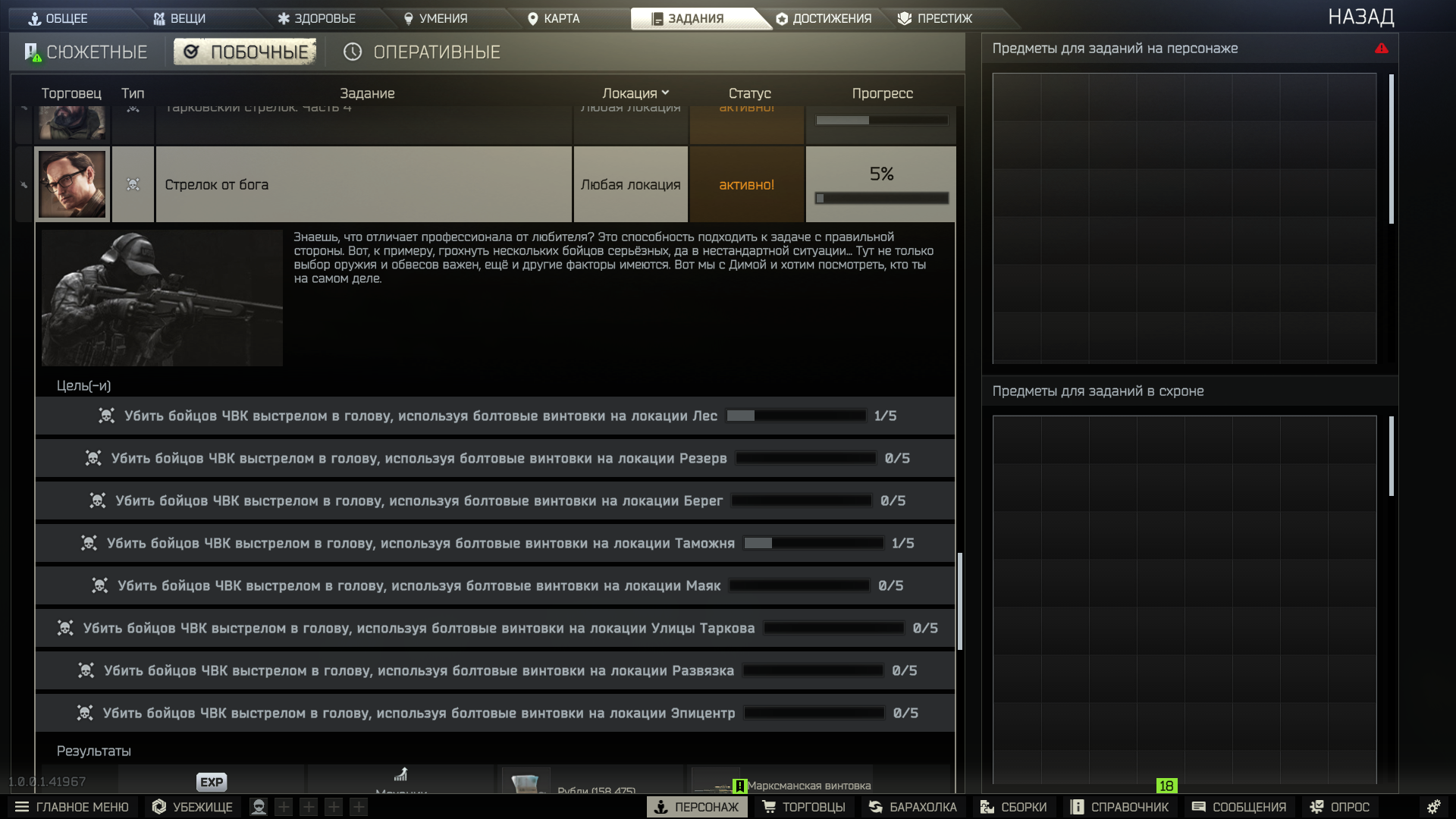 Также в Таркове присутствуют ежедневные и еженедельные испытания, но они не могут похвастаться пользой. Задачи в них всегда случайны и могут потребовать неадекватные цели. При этом, награда за такие квесты тоже подбирается случайно. В одном случае вам могут дать хорошую винтовку за два 2 успешных рейда, а в другом — пару коллекционных фигурок за убийство десятка бойцов ЧВК.