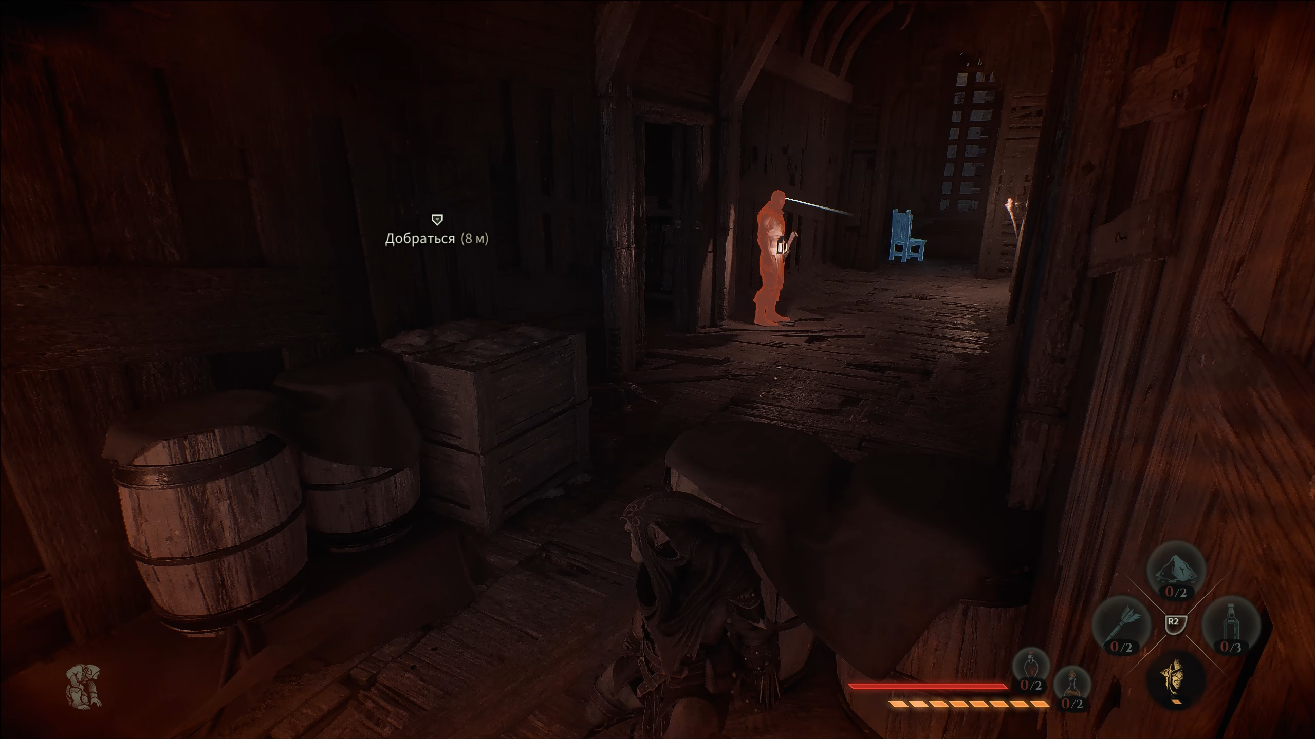 Поэтому важно следить за уровнем шума по индикатору, направлением взгляда стражников через «янтарный взгляд» (местный аналог ведьмачьего чутья), тушить источники света и учитывать тип поверхности. Шаги по ковру и другим мягким материалам приглушаются — это критично, например, если вы крадётесь мимо спящего стражника. Ну и, разумеется, не стоит забывать прятать тела или самому скрываться в шкафах, сундуках либо, прижавшись к стене, растворяясь в тенях.