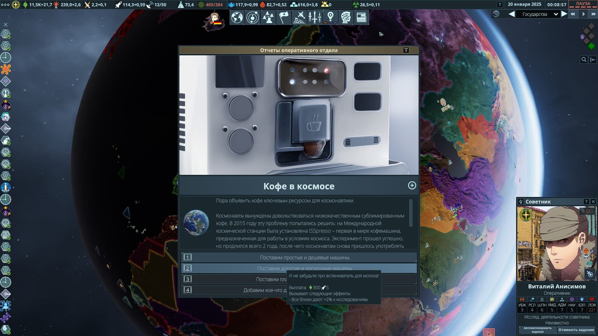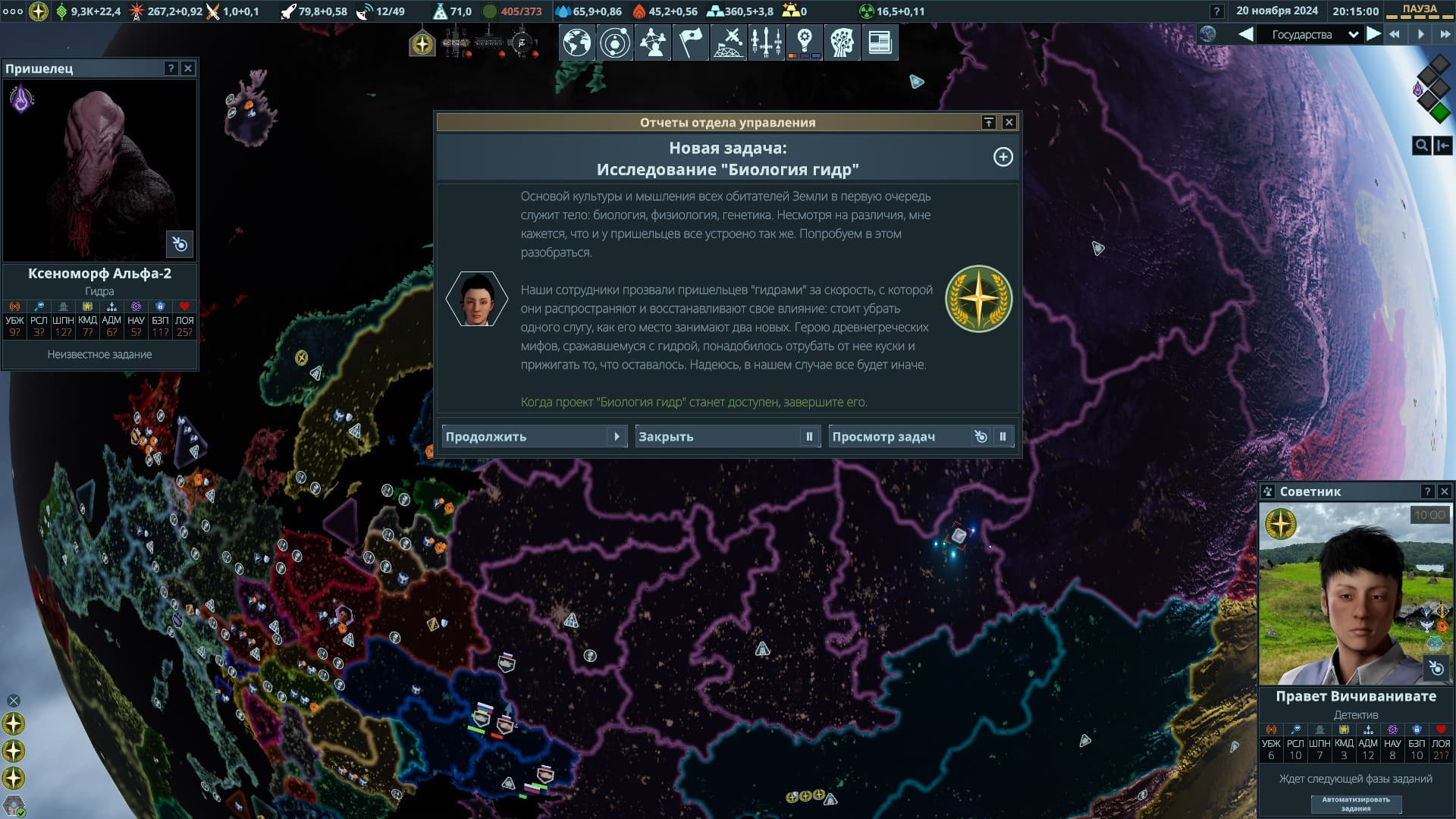 А вот сложность освоения древа технологий соответствует внешности. В нём нужно выбирать из сотен проектов, чтобы развиться в нужном для своей фракции направлении. По умолчанию стоит случайная выдача проектов для исследования, которая может выдать что-то ненужное в сложившейся ситуации. Во время прохождения игра решила, что я хочу завоевать всю Землю, и упорно подсовывала связанные проекты.