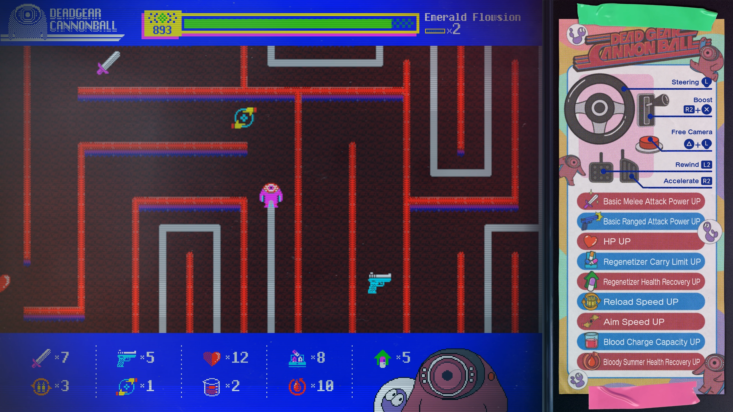 Прокачка характеристик также вынесена за пределы привычных меню с сухими цифрами. Улучшение параметров происходит в аркадном лабиринте DeadGear Cannon, явно вдохновлённом Pac-Man. По полю разбросаны значки здоровья, урона и других характеристик, а длина доступного маршрута определяется ресурсом, накопленным за уничтожение врагов.