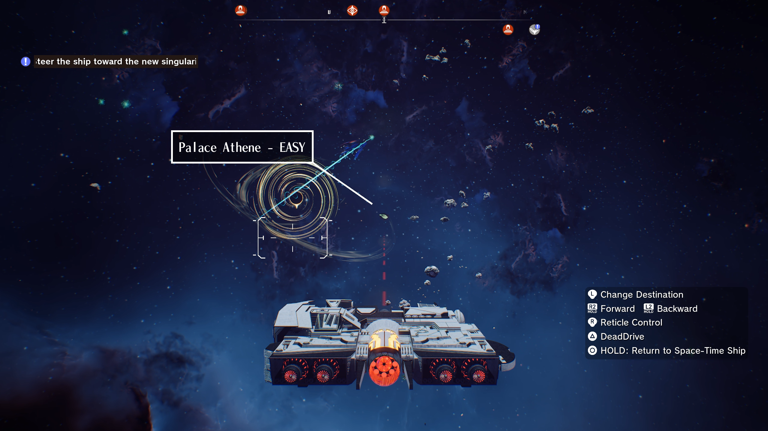 После этого игрок может взять управление звездолётом и выйти в открытый космос. Отсюда можно либо отправиться к следующей сюжетной главе, либо заглянуть во «Дворцы Афины» — процедурно генерируемые подземелья, где добываются нашивки с пассивными эффектами и дополнительные ресурсы для прокачки. Заодно во время полёта имеет смысл перехватывать пролетающий космический мусор: собранные материалы затем обмениваются на компоненты для улучшения оружия.