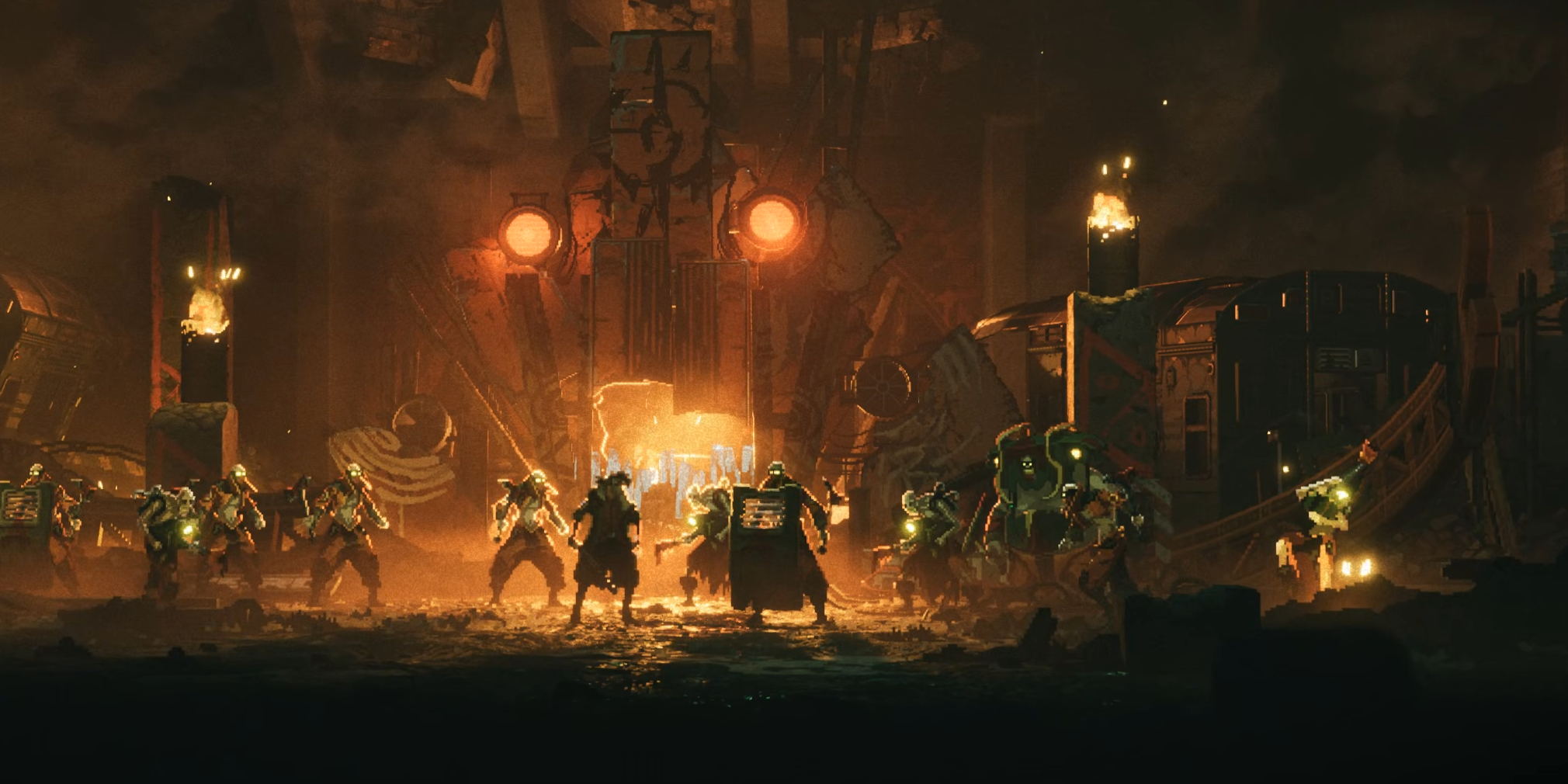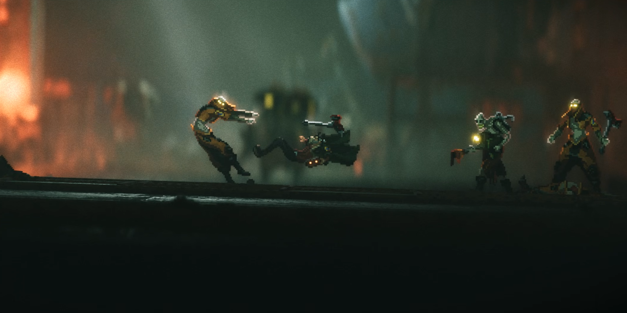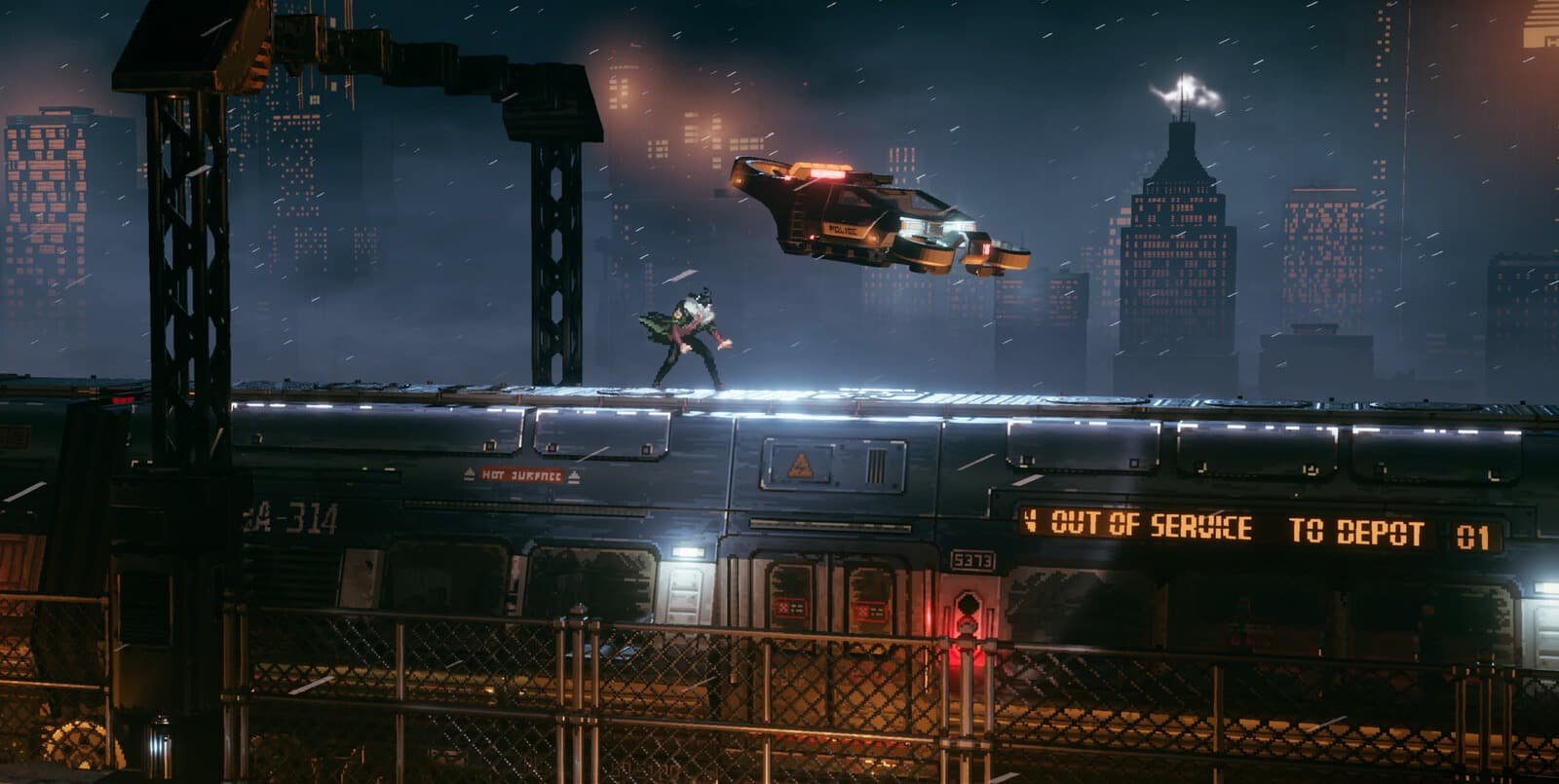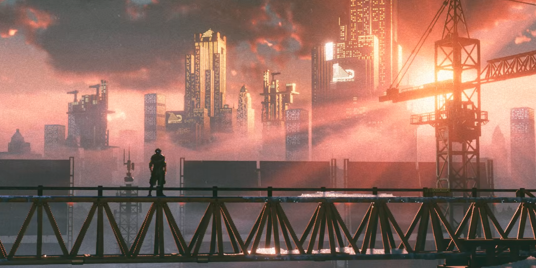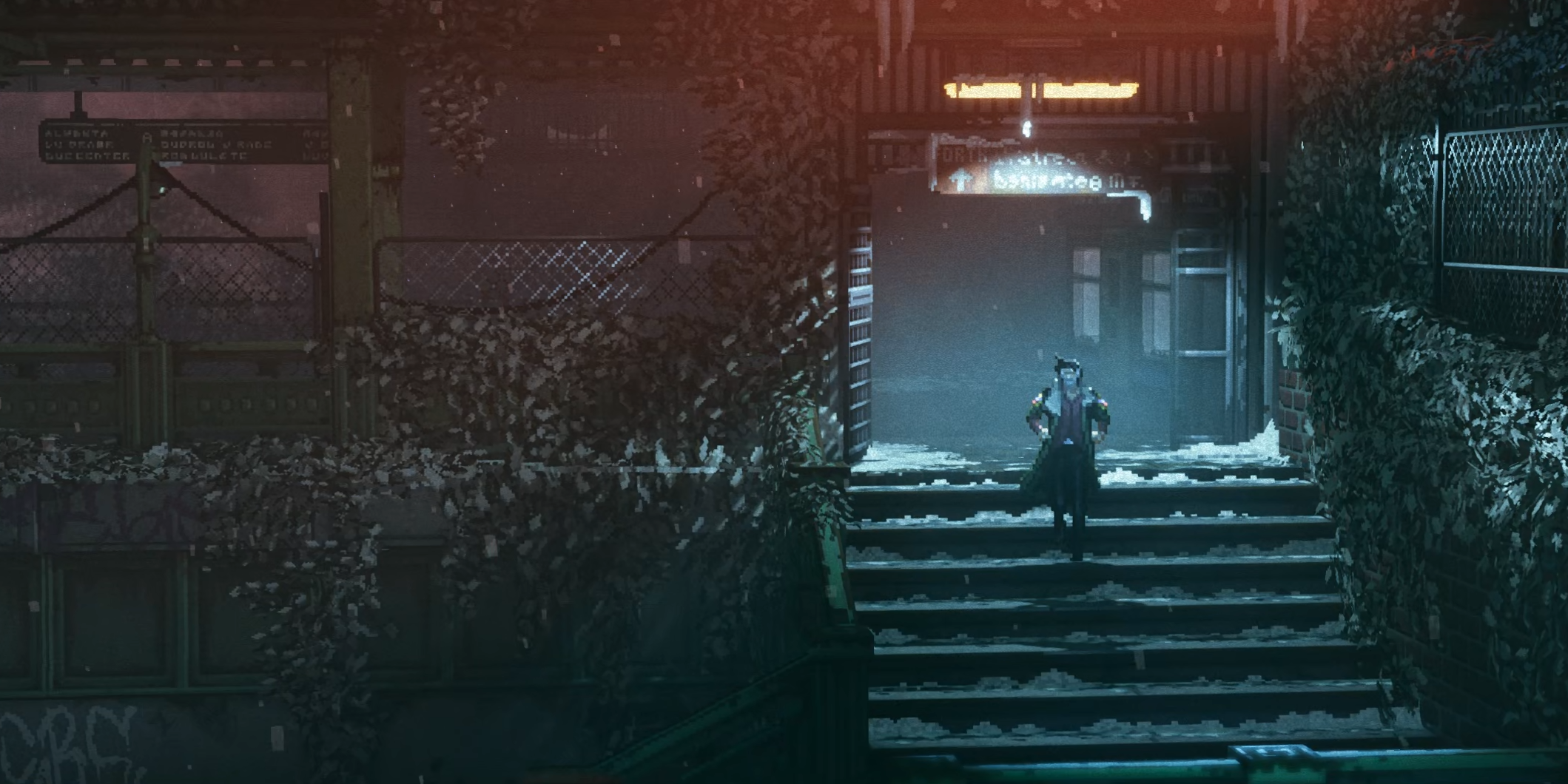Если у REPLACED и есть область, в которой она безоговорочно оправдывает годы ожидания, то это визуальная подача. Игра действительно выглядит великолепно. Пиксель-арт здесь сочетается с объёмным светом, дымом, глубиной сцены и проработанными задниками. Осенние руины, промышленные зоны, грязные городские закоулки, тоннели, станции, неоновые улицы, заснеженные территории в поздних главах, сцена на поезде — почти в каждой главе есть хотя бы несколько кадров, на которых хочется задержать взгляд. Но лично меня сильнее всего впечатлил почти запредельный уровень постановки и операторской работы.
