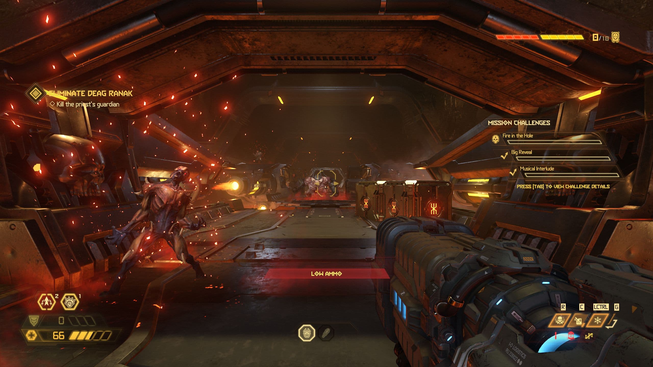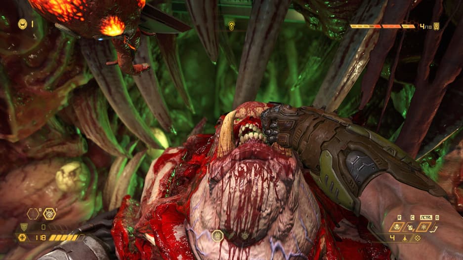 Можно отвлечься на собирательство секретов и предметов для усиления героя, в том числе дополнительные жизни для мгновенного воскрешения и продолжения сражения без возвращения к контрольной точке. Правда, локации перегружены бонусами, и сталкиваешься с подходом «тайники ради тайников». Не все апгрейды используются, а в карманах оседают жетоны для костюма, очки для оружия, руны, вещи для разблокировки других вещей и бонусы для пропуска испытаний. Доходит до того, что после прохождения всех шести «Врат Палача» (сложные сражения) выдают знакомую фанатам Doom 64 пушку, а она… использует те же патроны, что и BFG 9000. И вчистую проигрывает конкуренту! Остаётся насладиться фан-сервисом и пойти дальше.
