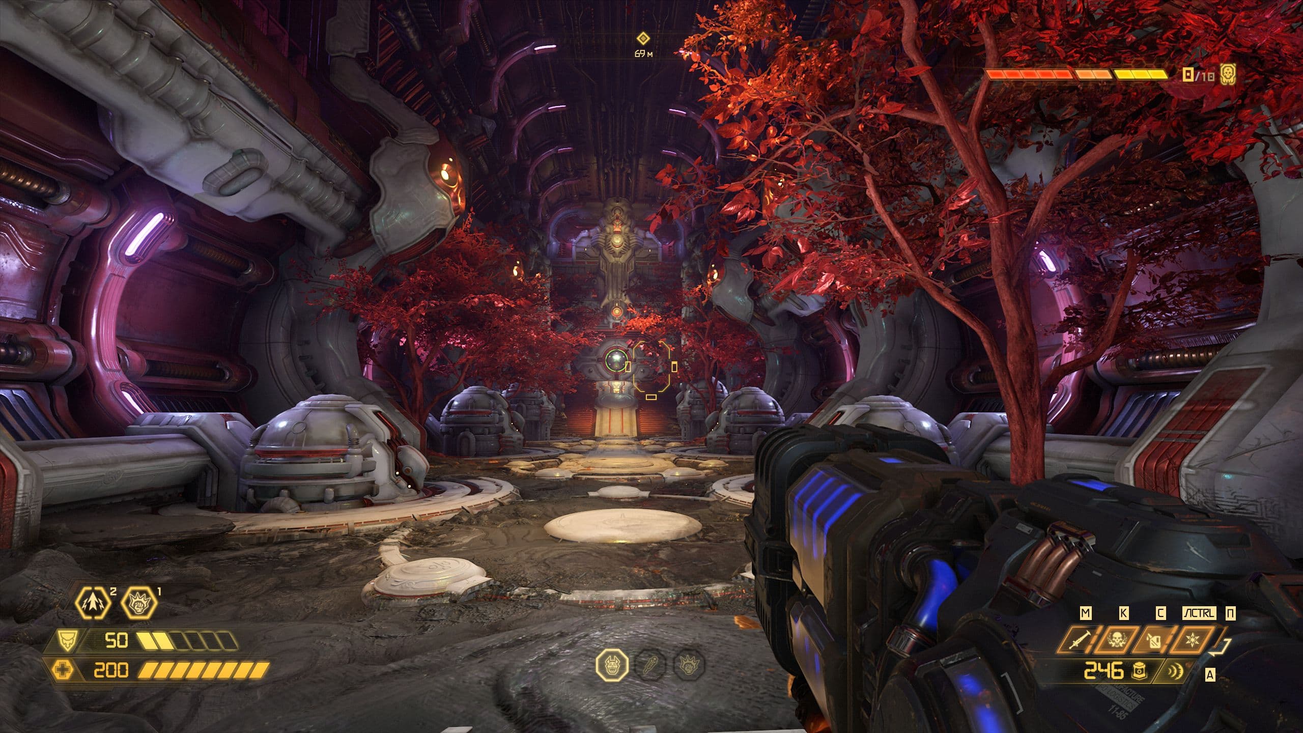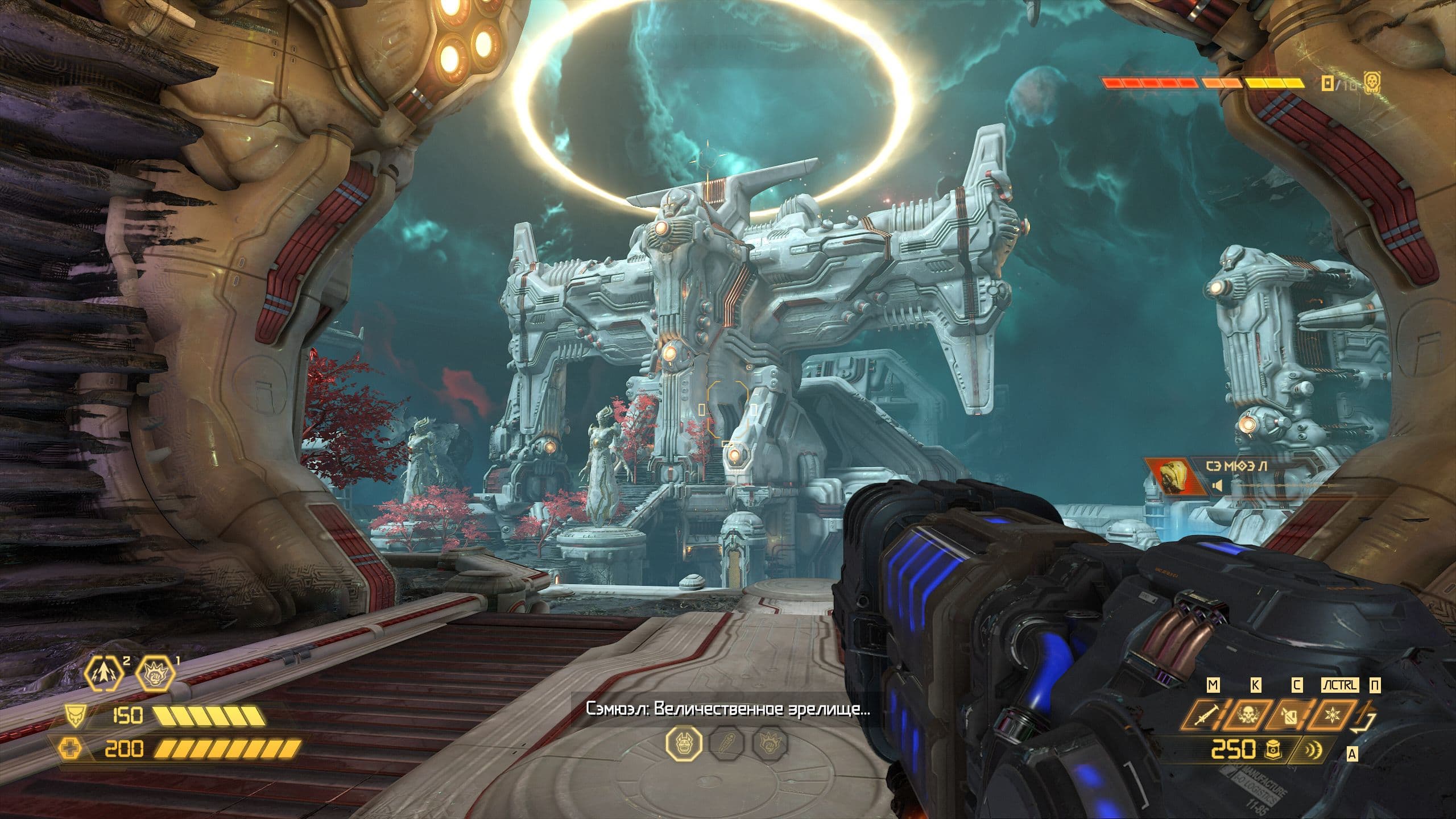 Беда в том, что даже с изучением всех материалов проблематично воспринимать вселенную Doom Eternal как самобытную реальность, живущую по своим законам. Локации и, особенно, арены напоминают искусственное нагромождение объектов, где всё подчинено исключительно механике. Кругом кричащие подсказки, секреты в форме ярких знаков вопроса и неестественное даже с поправкой на фантастичность окружение. Будто попал в виртуальный тренажёр, несмотря на то, что декорации иногда балуют сочетанием фэнтези и футуризма и величественными постройками.