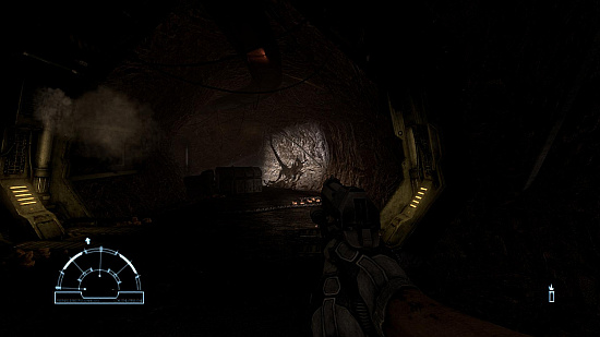 Жаль, но антураж подпорчен реализацией... Чужих. Вместо того, чтобы мчаться на морпеха со скоростью голодного гепарда, рвать его клыками и когтями, ксеноморфы вытворяют странные вещи: резко останавливаются, бросаются из стороны в сторону, ползают вокруг и по стенам-потолкам, запутывая, но не нападая. Поэтому встречи с ними ныне отнюдь не держат в напряжении. Знаешь, что перед атакой будет обязательный танец, будет время навести прицел и спокойно выстрелить. Улетучивается и предвкушение будущего сражения из-за повторяющихся игровых моментов. Курсант оказывается запертым в комнате и вынужден расправляться с набегающими волнами Чужих. Отправили на тот свет троих ксеноморфов – получите ещё пяток. И так далее, пока лифт не приедёт, или дверца не откроется. Такие ситуации делают игру предсказуемой. Герою словно сообщают: «Сейчас попрут, приготовься». Готовишься, отстреливаешь, а в остальное время гуляешь по пустым коридорам со стандартным арсеналом из пистолета, автомата, дробовика и снайперской винтовки. Редко выдают огнемет или пулемет – расслабиться, выпустить пар, нажатием одной кнопки уничтожить лавину тварей и гордо отбросить в сторону раскаленное оружие. Застали врасплох? Не беда. Блокируем выпады, бьем прикладом и посылаем меткую пулю в череп остолбеневшего от такой наглости Чужого.