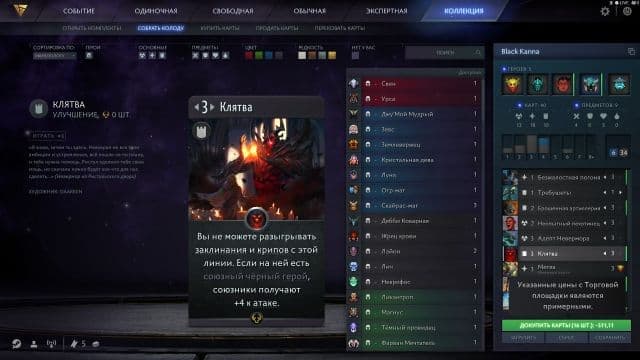 Итак, за сумму, равную 20 долларам, покупатель Artifact получает две стартовые колоды и 10 комплектов, в каждом из которых находится 12 случайных карт. Звучит неплохо, но на деле вам придётся дополнительно потратиться на то, чтобы собрать свою первую конкурентоспособную колоду.