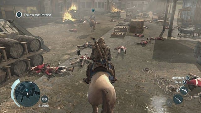 Нельзя сказать, что сложность повысилась или в боевой системе открылось второе дыхание, но схватки заметно прибавили в скорости. При этом зрелищность нисколько не пострадала. Коннор напоминает разъярённого хищника. Он вгрызается в солдат, рубит их тела и использует в качестве живого щита. Огнестрельное оружие стало неотъемлемой частью поединков, враги поголовно вооружены мушкетами. Ассасин тоже не стесняется палить из пистолей. Даже бутылки, бочки и другие подручные вещи находят своё применение в ходе драки.