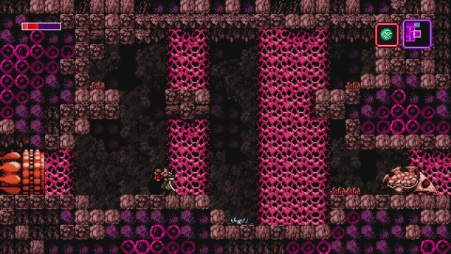 То, что Axiom Verge — верный последователь двухмерных частей серии Metroid, заметно сразу. Трейс пробирается по цельному миру-лабиринту. По пути он наталкивается на не шибко агрессивных супостатов, многие их которых мешают ему в процессе прыжков по платформам. Незатейливая акробатика и стрельба по забавным зверушкам разбавляется применением различных устройств.
