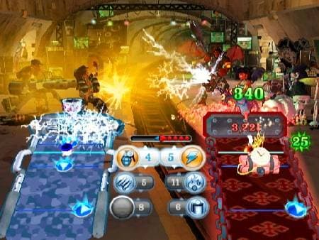 Здесь не размениваются на мелочи, вроде подрезания струн, бомб-вонючек или артиллерийских обстрелов гнилыми помидорами. В микрофонах, гитарах, контрабасах, трубах, синтезаторах и магнитофонах спрятан целый арсенал. В ход идут снаряды, пули, молнии, огнеметные струи, осколочные и дымовые гранаты – война идет по всем правилам. Лишний раз суетиться ни к чему. Достаточно просто выполнять прежние простейшие движения. Необходимый тип атаки со временем сам появится среди нот и автоматически активируется при нажатии. Игрок лишь переключает один из трех типов снарядов, да блокирует электрощитом атаки противника. Перестрелкам отведено даже специальное место в песне. Сразу после припева игроки только и делают, что обмениваются серией ударов, позабыв про всякое музицирование. К сожалению, визуально все атаки проходят однообразно и без последующих вариантов. Увидели один раз огнеметную струю из тромбона или вылетевший снаряд из контрабаса – все, дальше будет то же самое.