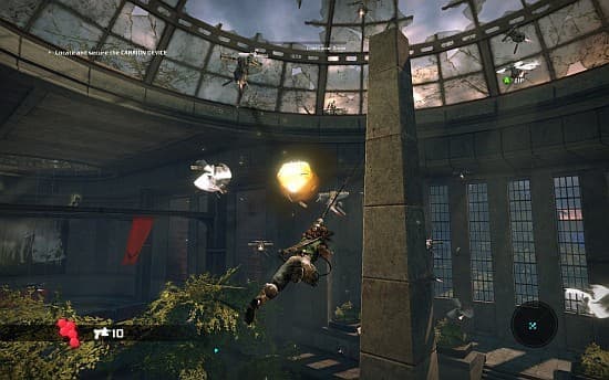 Основная часть путешествия проходит по принципу «вот тебе контрольная точка на радаре – отправляйся в указанном направлении». Ничего особенного, но ведь у героя есть механическая рука на веревочке! Он способен хвататься за объекты, раскачиваться на них, взмывать в воздух и парить над развалинами! Фанаты Паука ликуют. Занятие это требует постоянного внимания. Прежде чем двинуться вперед, необходимо в определённое время (на экране возникает значок) отпустить захват, потом выбрать следующую цель, уцепиться за неё и так далее. Нельзя забывать и про ограниченную длину манипулятора, чтобы не свалиться в пропасть. Подобный подход потребует немного времени для освоения, но впоследствии проблем не возникает. Только в отличие от Питера Паркера с его открытым на все четыре стороны Нью-Йорком, Бионик ограничен узким коридором. Начинаются проблемы.